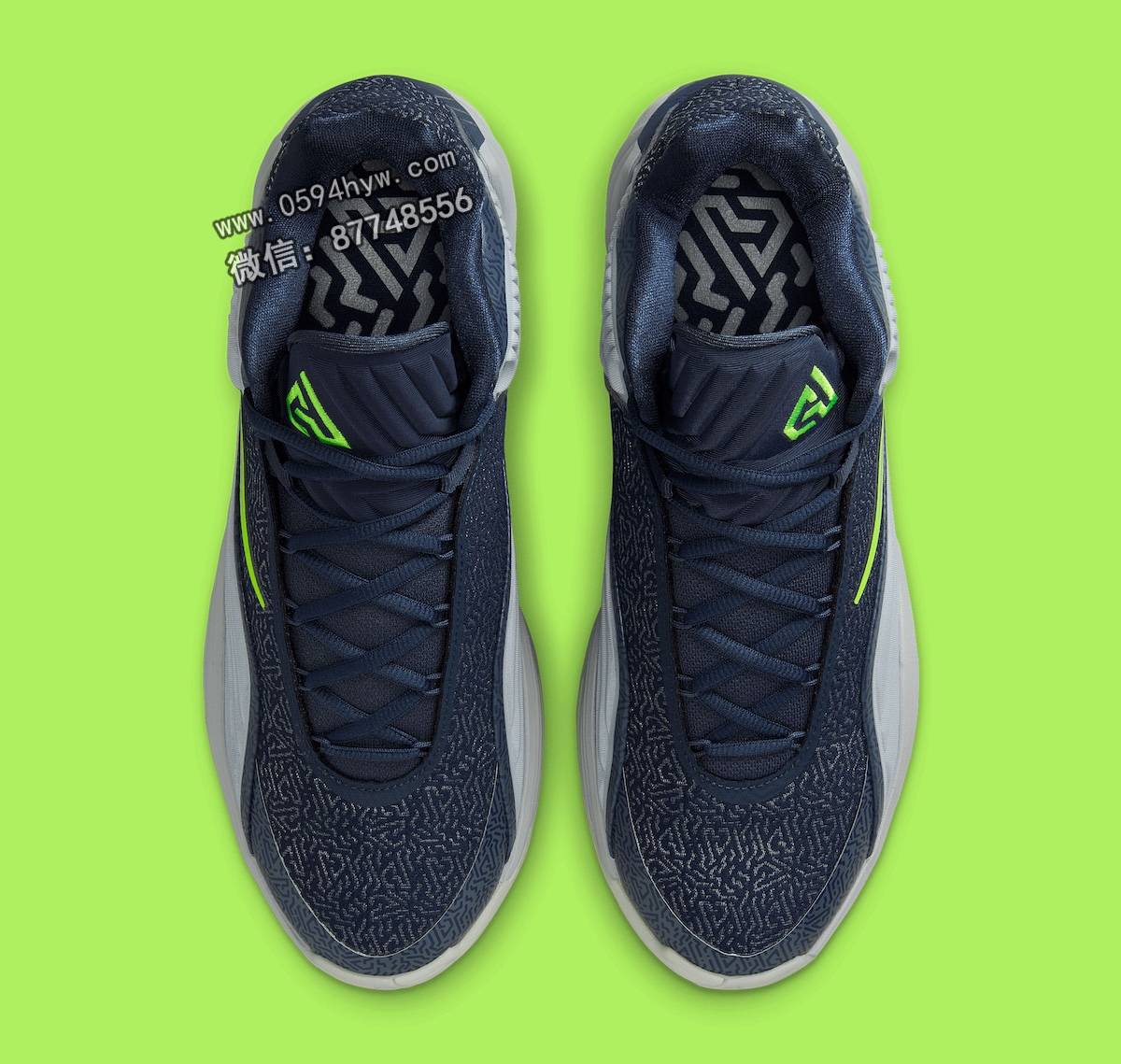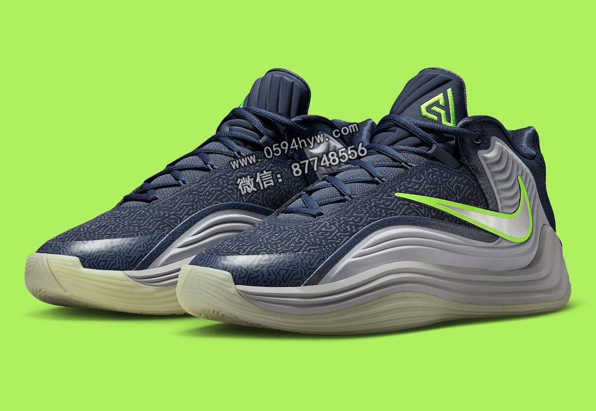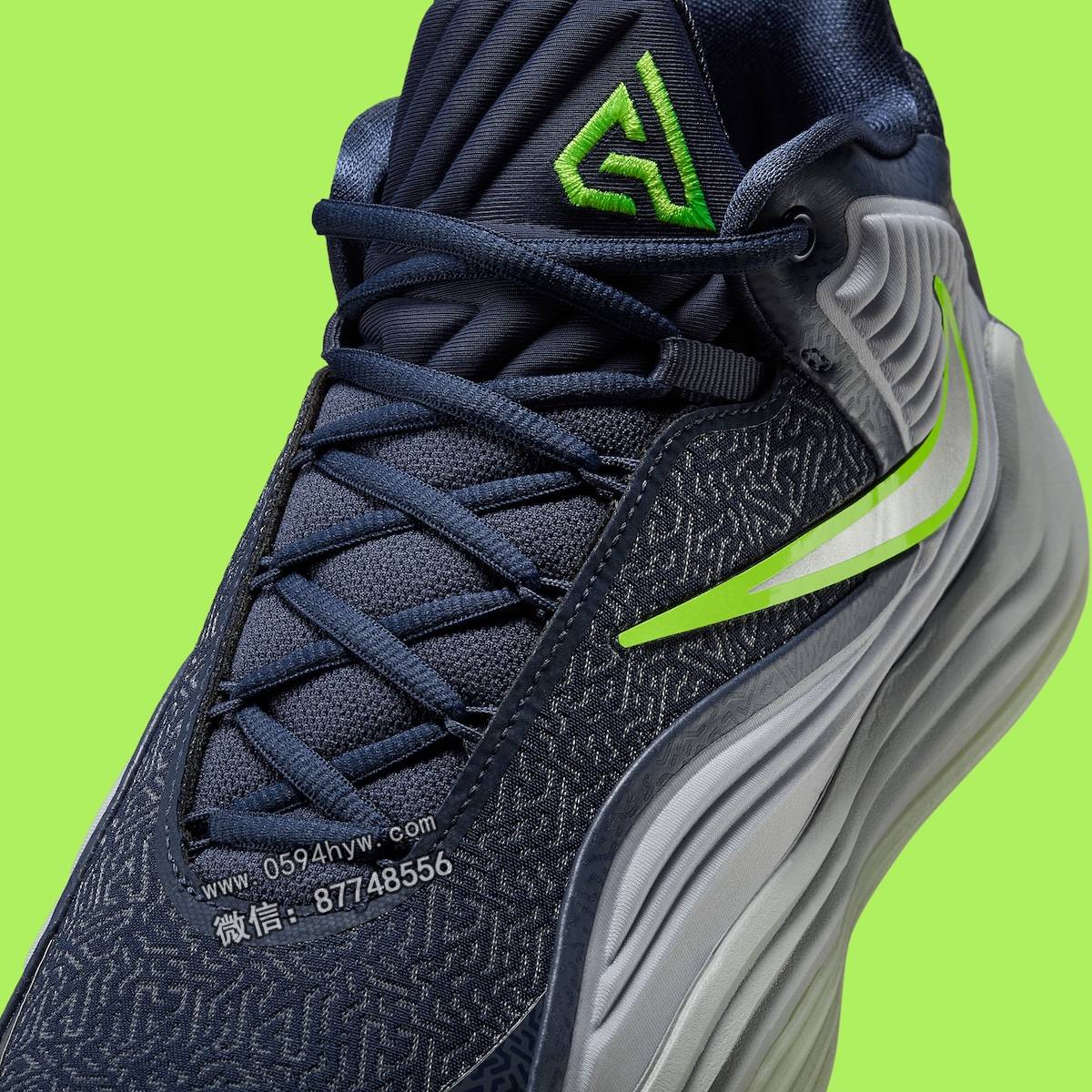 雕刻金属 Swoosh 以伏特绿为轮廓,是鞋侧上方的突出亮点。Giannis Antetokounmpo 的标志性刺绣徽标以霓虹色处理在鞋舌上。