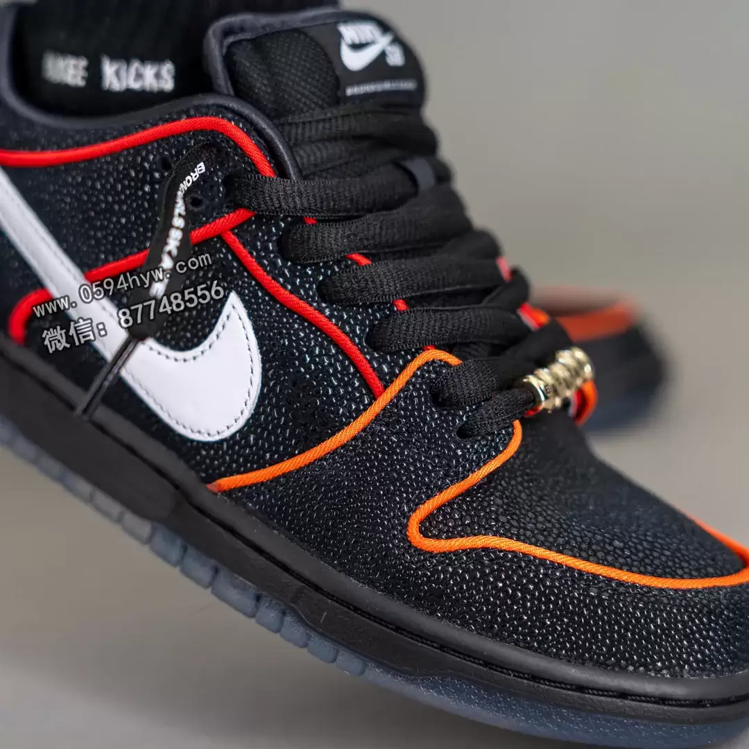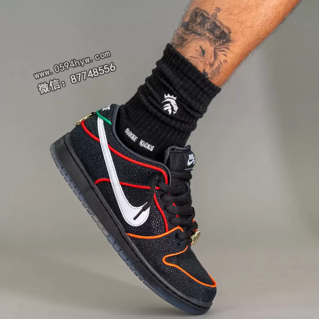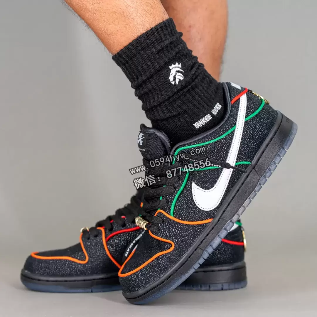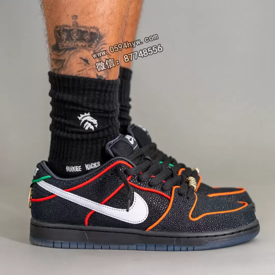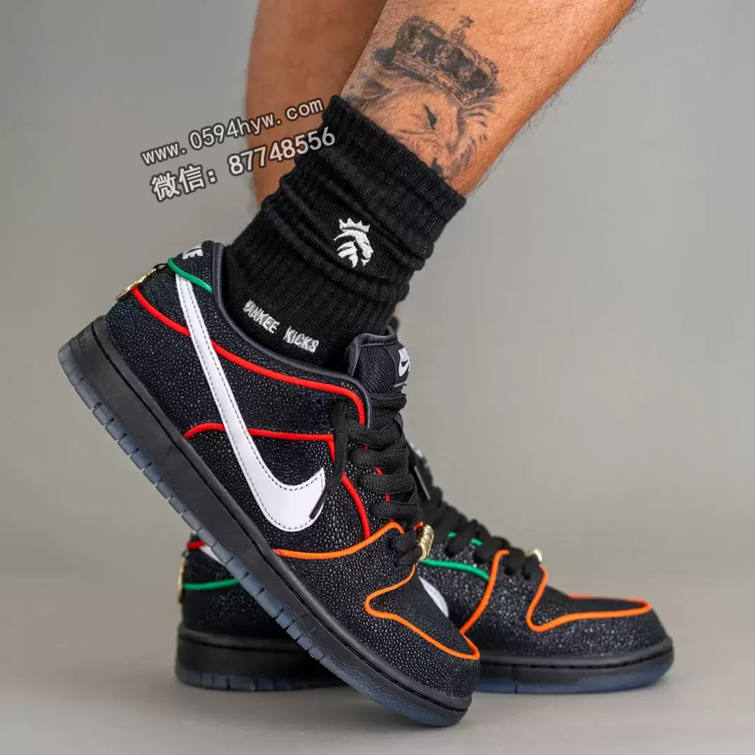 SB Dunk Low 采用了大胆的黑色、白色、挑战红、全橙色、幸运绿和烟灰色配色。现在,这款鞋的鞋面已经完全呈现出来,包括带有彩色滚边的黄貂鱼纹理皮革和干净的白色 Swoosh,以平衡鲜艳的色调。