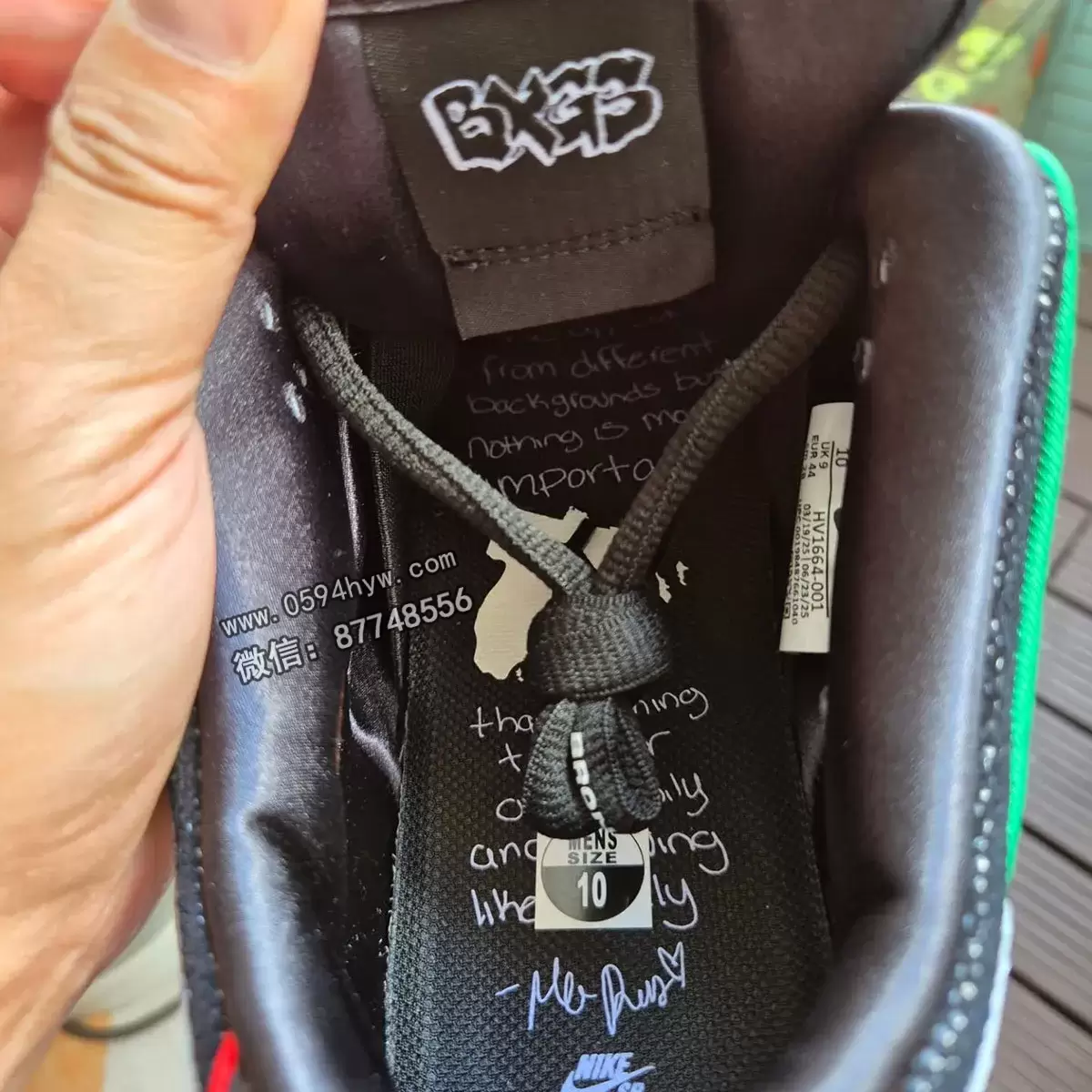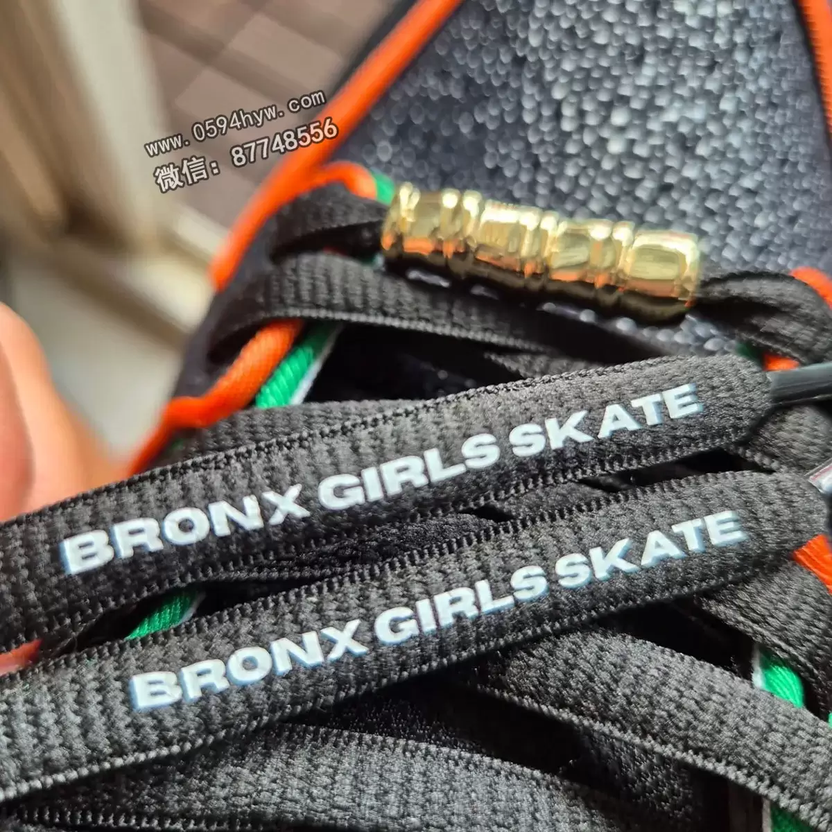 特别的细节包括金色花边吊饰和印有激励性手写信息的鞋垫。这些元素反映了 Bronx Girls Skate 的使命,即提升整个纽约市的妇女、女性和性别扩张型滑冰者。