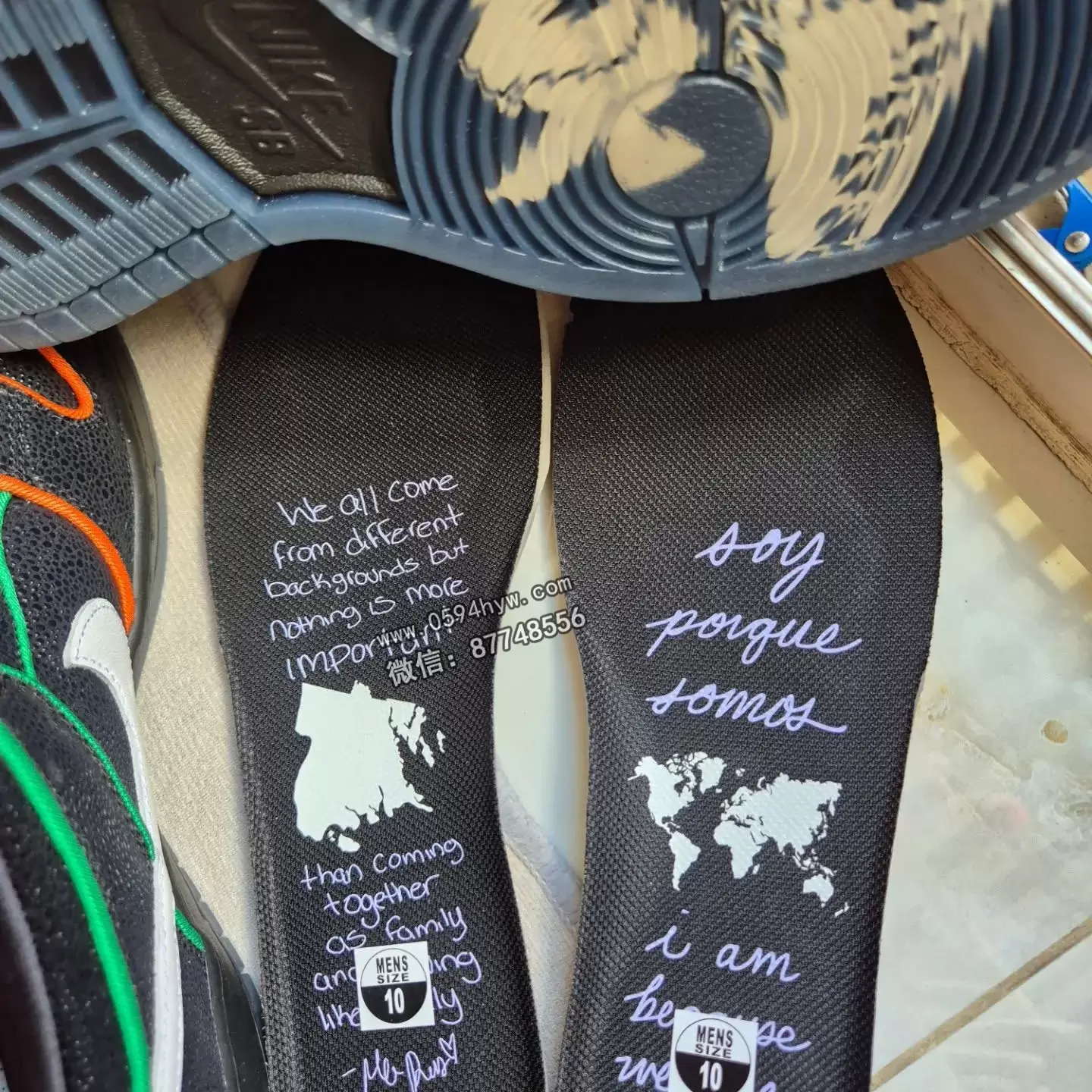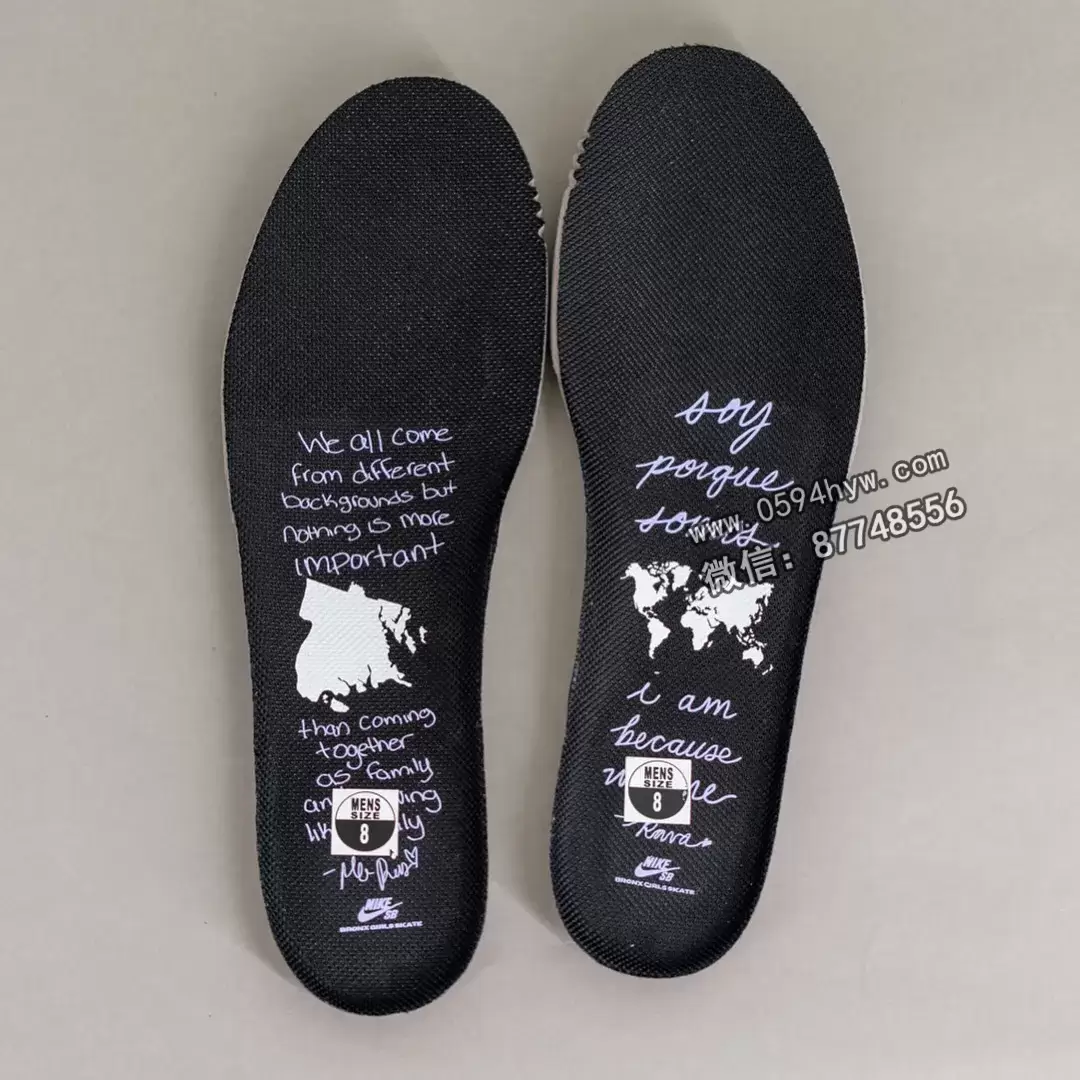 半透明外底上的 “BX “和 “GS “图案位于纽约市地铁桥的下方,是该区文化和运动的视觉代表。Bronx Girls Skate SB Dunk Low 的定制鞋垫内有两句新的引语,分别是 “我们来自不同的背景,但没有什么比一家人在一起更重要 “和西班牙语翻译 “Soy porque somos”(”我是,因为我们是”)。