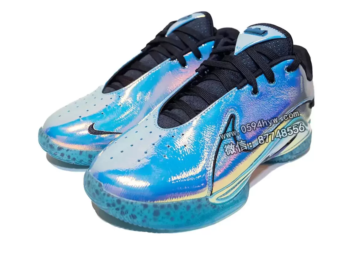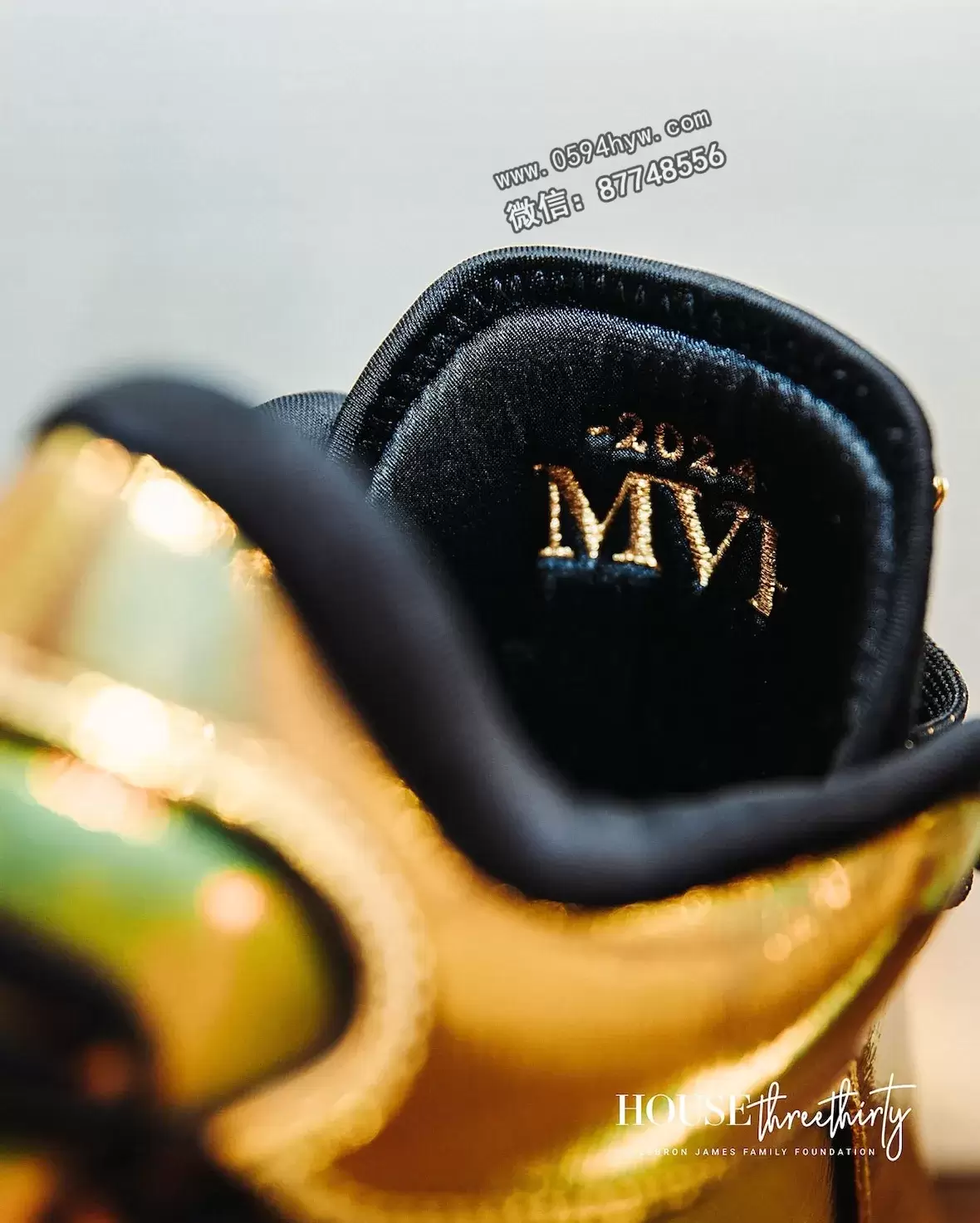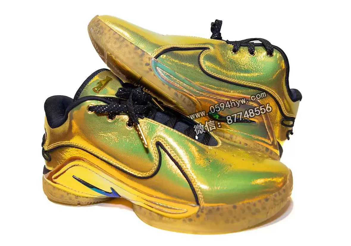 LeBron 22 包包括一对金属配色。其中一款为金色,另一款为彩虹蓝。质感皮革鞋面、反光点缀、定制刺绣细节(包括鞋舌内的 “MVP 2024 “印章)、半透明外底和鞋垫上的大理石耐克 “胜利女神 “印花构成了每双鞋的其他主要设计特色。