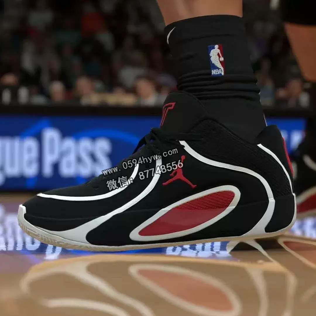 在《NBA 2K26》中,乔丹-塔图姆 4 最初预示了一个更加大胆的方向。即将推出的配色是对球员根源的回归,羽量级的黑色轮廓配以流线型的白色点缀,并在大学红的面板上进行了叠加。设计借鉴了塔图姆 3 的纤薄结构和耐克 Air Flightposite One 的轮廓,营造出一种未来感十足但又不失经典的整体氛围。值得注意的细节包括鞋舌上塔图姆的签名 “JT “标志、鞋跟上的超大红色 “0 “印记以及两侧的 Jumpman 品牌标识。