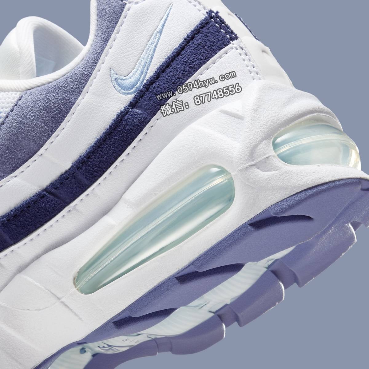 白色中底上的可视 Air 单元采用了淡淡的天青蓝色调,给人耳目一新的感觉。外底混合了冰蓝色和紫色,打造出从头到脚的整体外观。