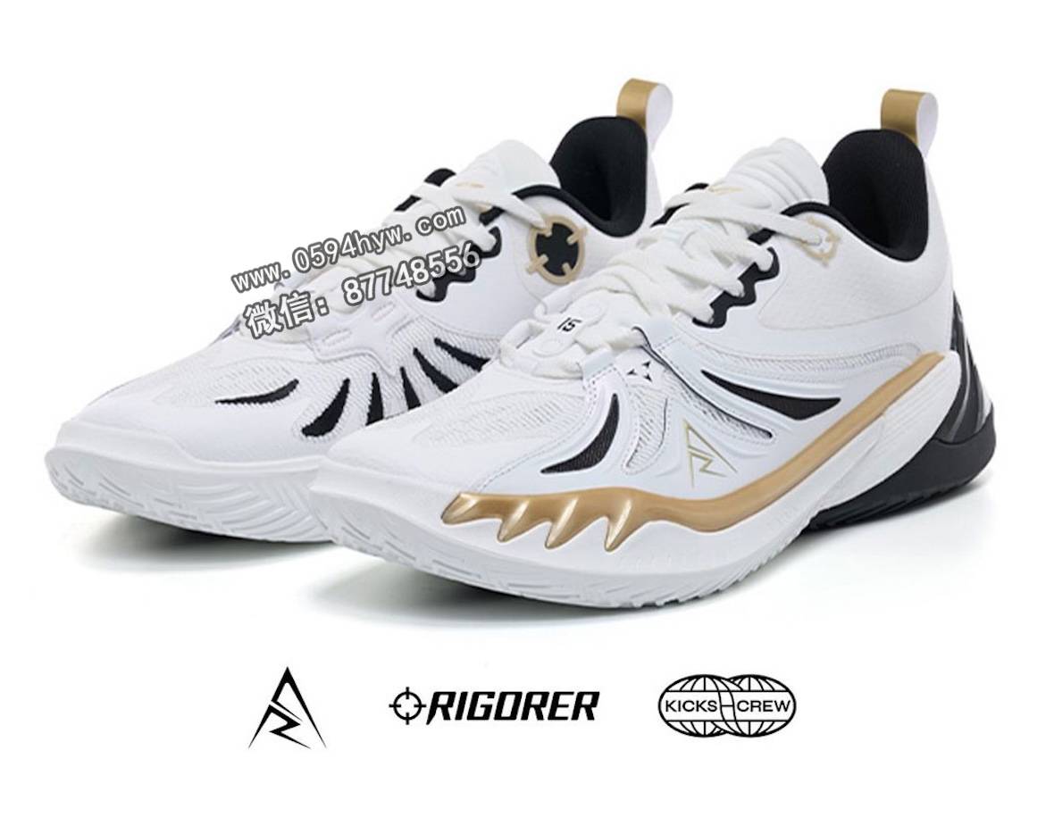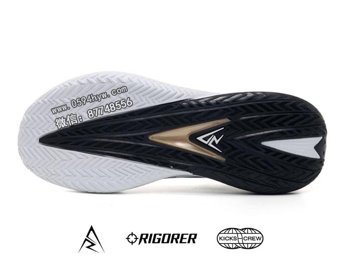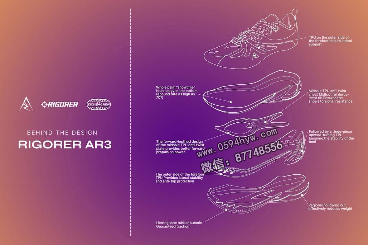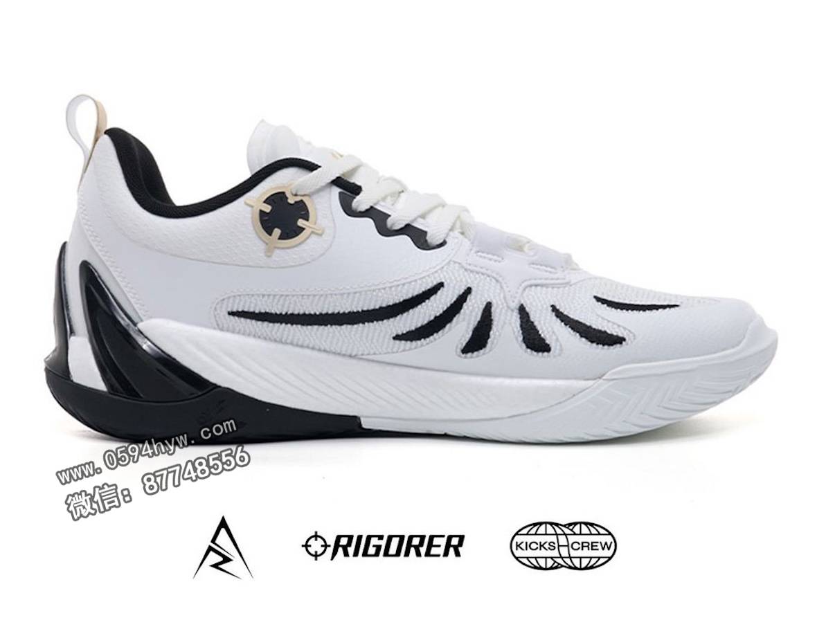 Rigorer AR3 延续了里维斯之前球鞋的成功,采用了类似但更精致、更透气的设计。灵感源自飞翼的鞋面、三重峰值 TPU 后跟支撑和全长 Showtime 泡沫缓震设计为这款球鞋提供了稳定的支撑。X 形 TPU 鞋板和人字形抓地纹路进一步增强了球场表现力。