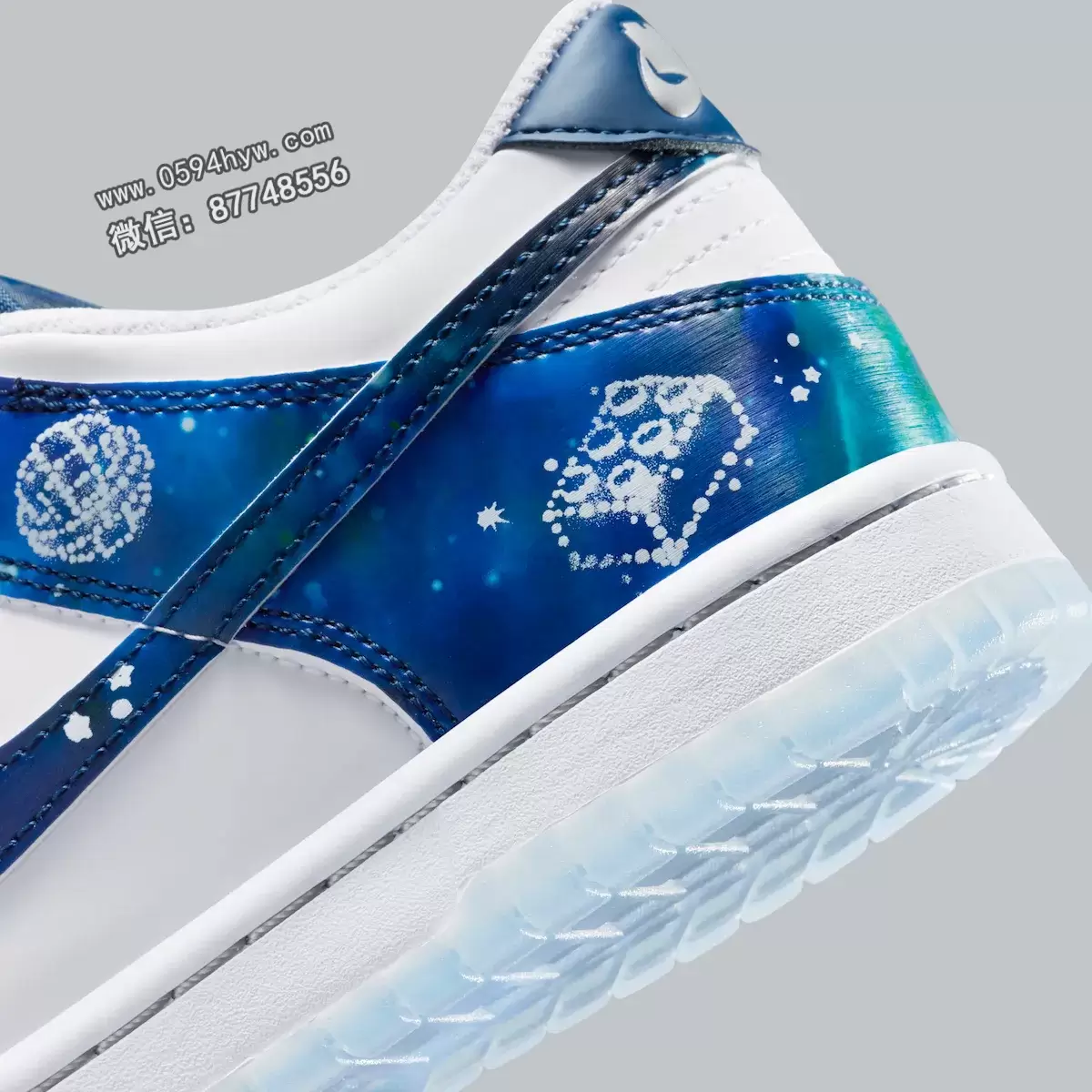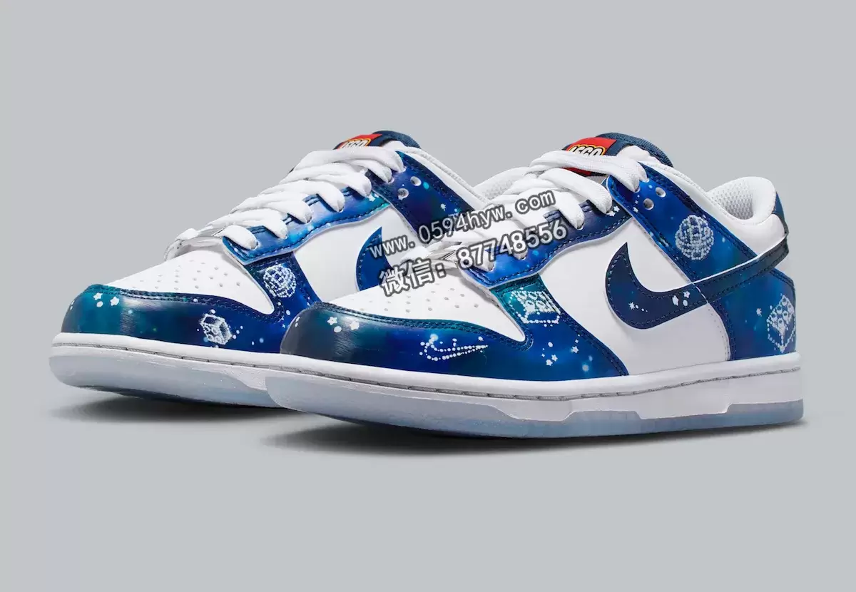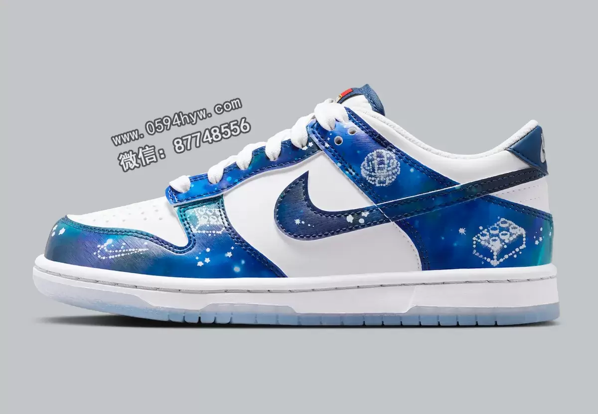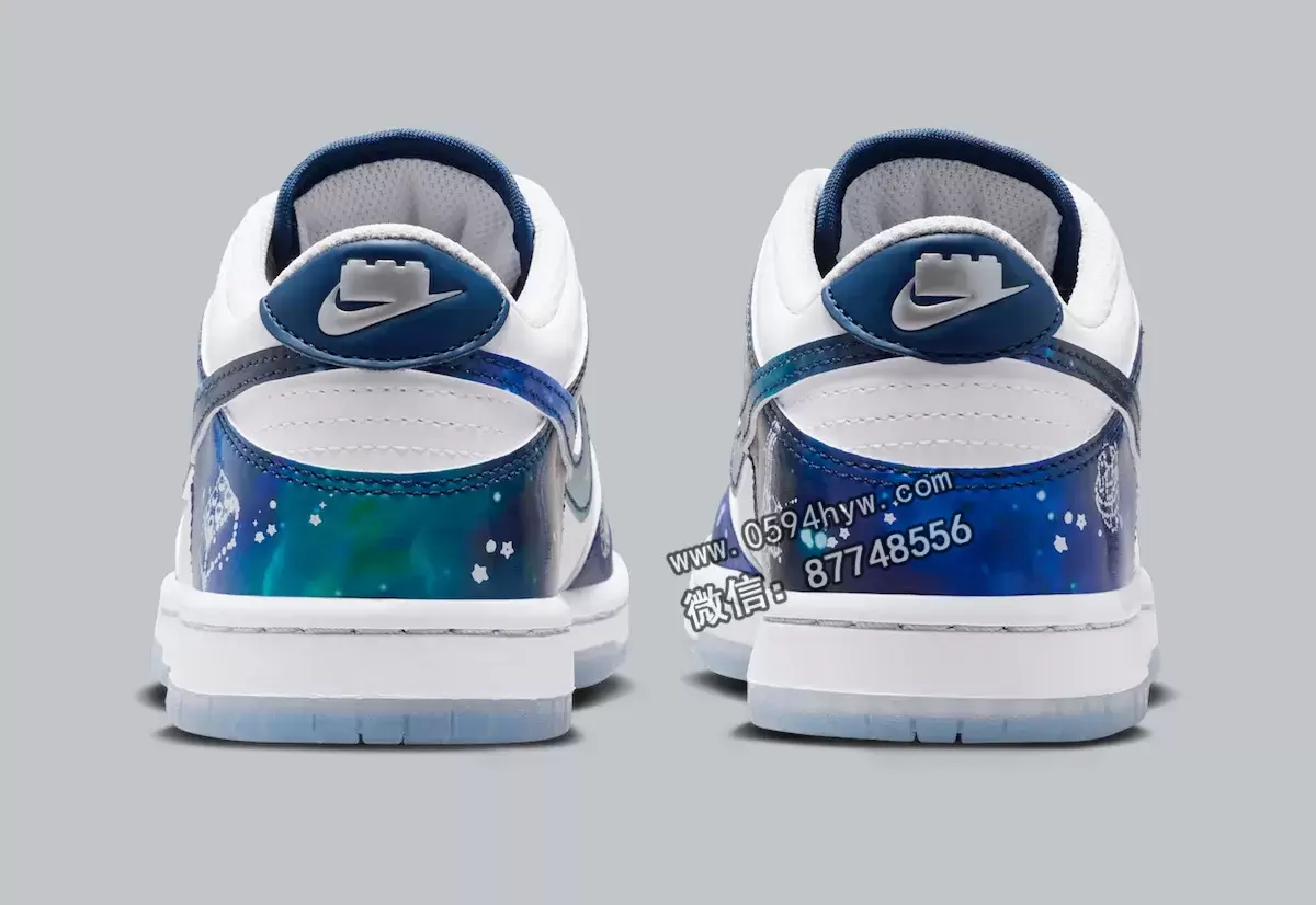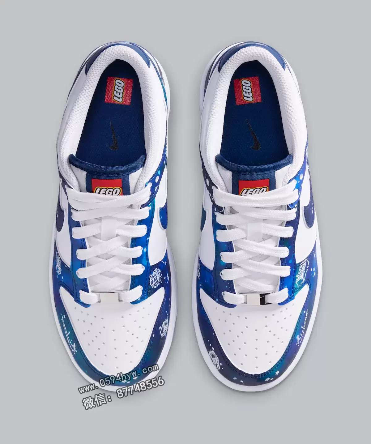 Galaxy” Dunk Low 采用白色皮革鞋面,鞋面上印有星系图案,并镶嵌有乐高砖块和 Swoosh 形状的星座。鞋舌上的亮色乐高品牌标签、半透明冰蓝色鞋底和限量版吊牌为鞋款增添了一抹亮色。鞋盒本身甚至可以变成一个六格的乐高砖盒,以防你收集到比鞋子本身更多的乐高砖块。