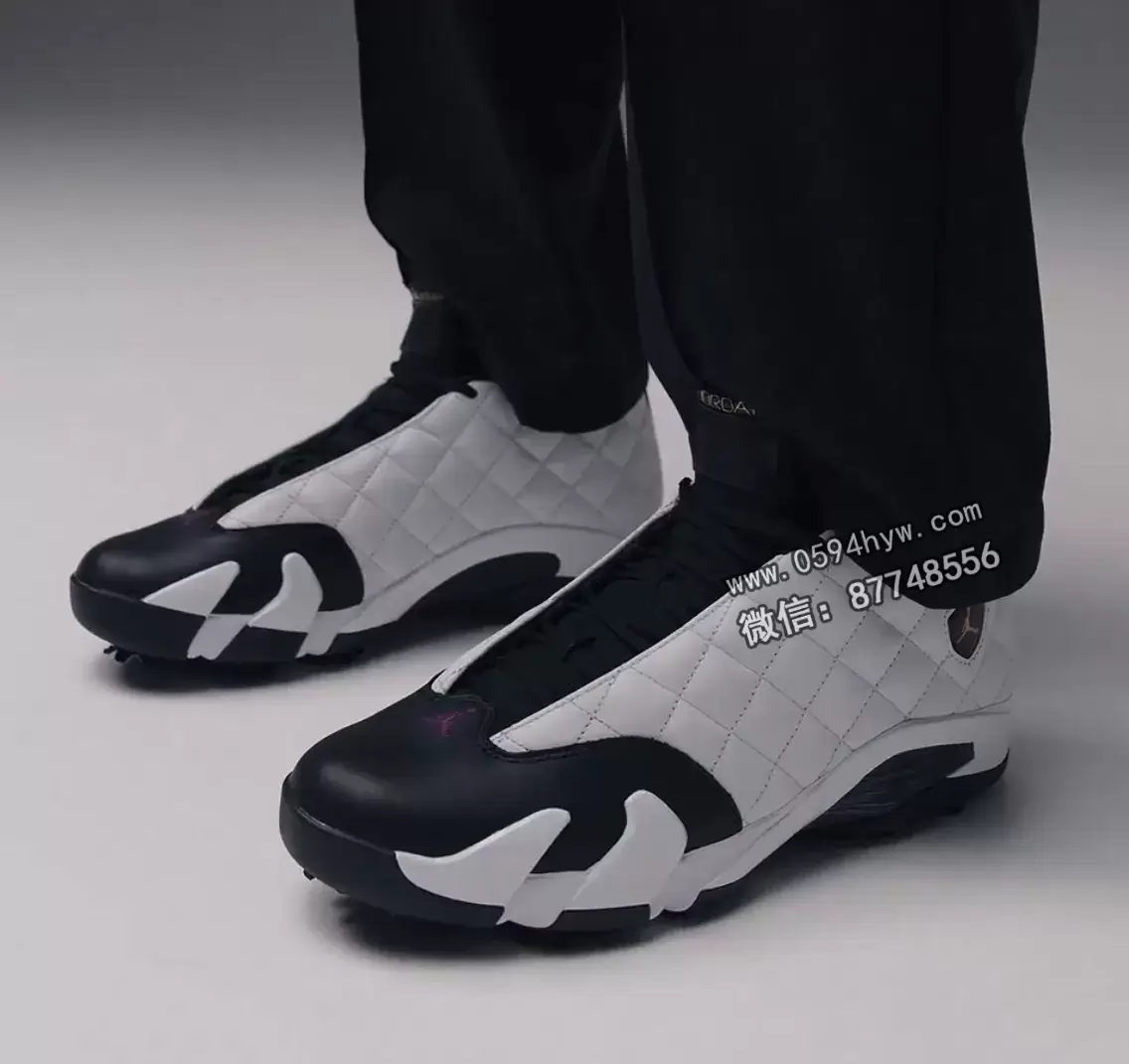 鞋面采用白色菱形缝线绗缝皮革。鞋头为黑色皮革,鞋舌为黑色,鞋带为黑色。鞋头印有波尔多跃马图案,鞋舌印有金色 “JORDAN “字样。后跟的圆形徽章与 AJ14 的赛车基因相呼应。