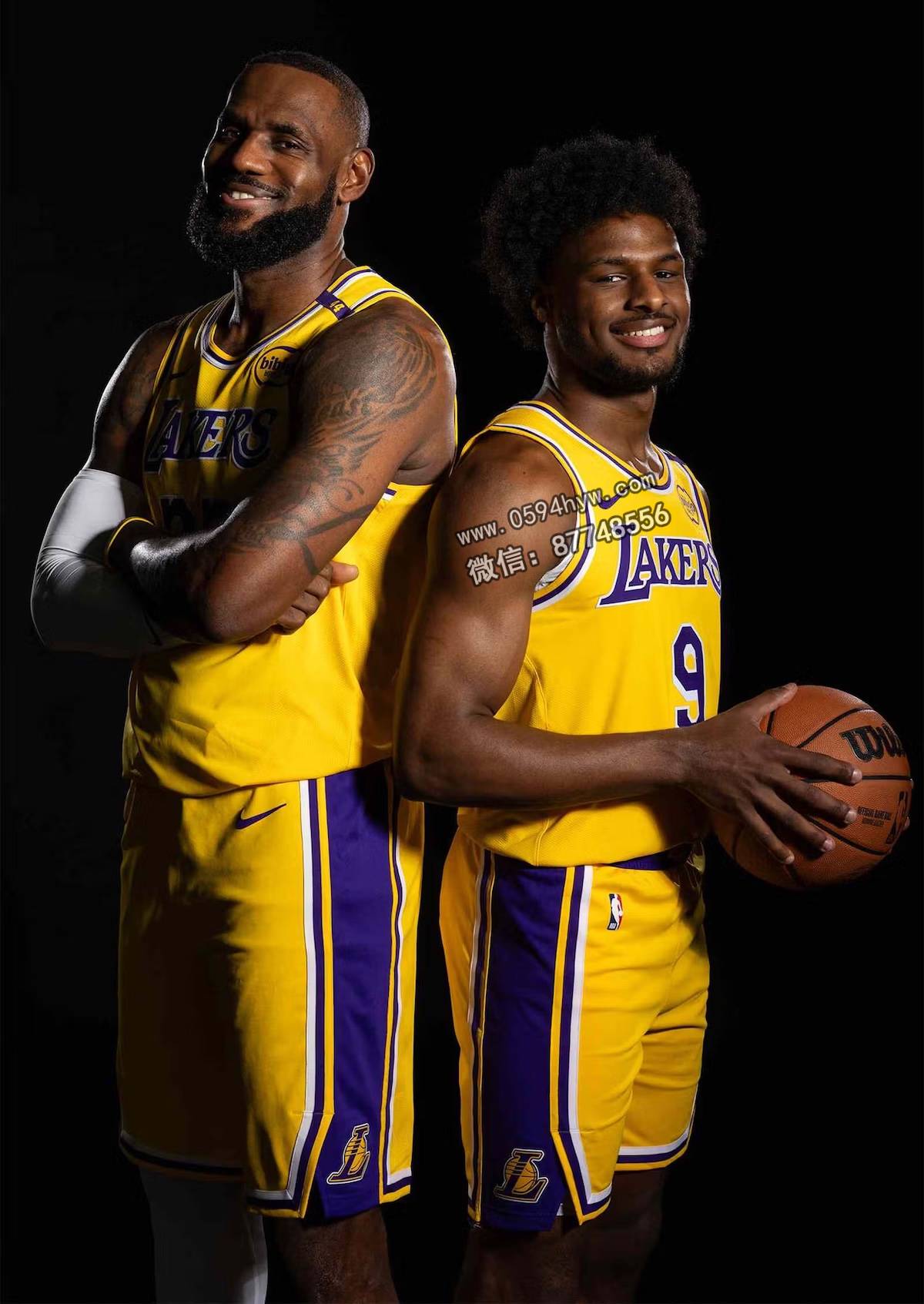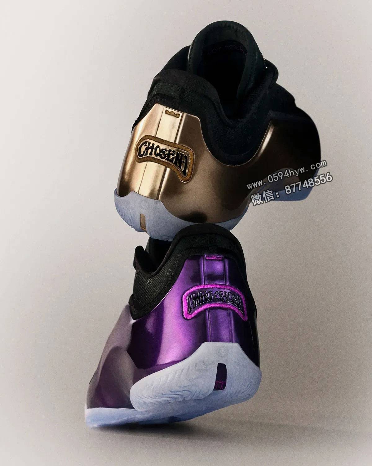 父子版的勒布朗 23 同样是错位配色:勒布朗的鞋面为金属金色,鞋跟处绣有 “Chosen “字样,而布朗尼的鞋面为深紫色,鞋跟处写有 “The One Who Chose “字样。每双鞋都采用黑色编织鞋面、冰冷的半透明鞋底和相互交错的印有字母图案的鞋冠,象征着他们之间的联系。