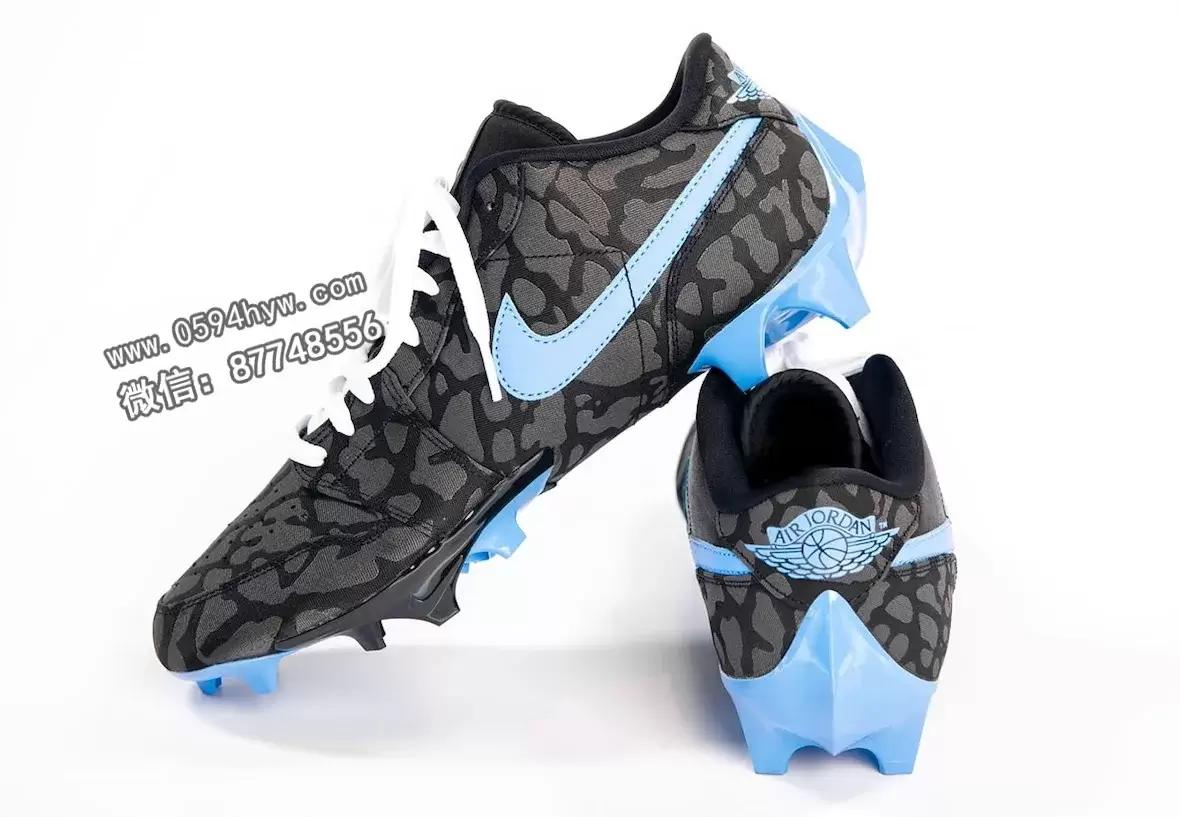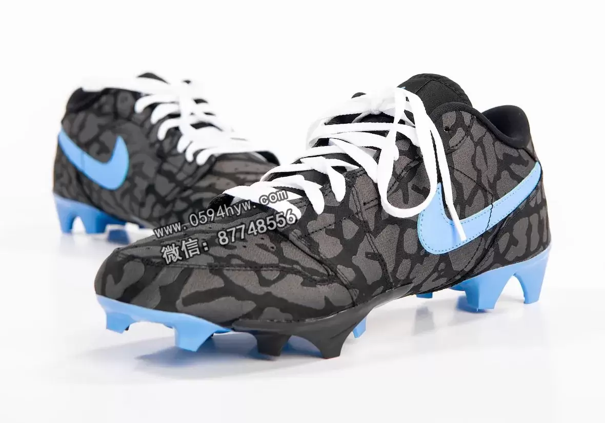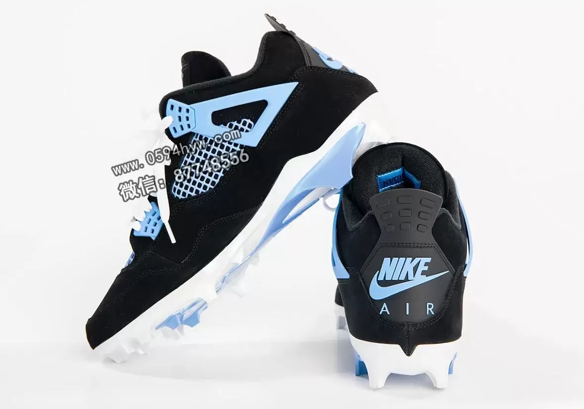 Air Jordan 4 Cleat采用黑色牛皮鞋面,鞋网、鞋翼和鞋跟品牌均以浅蓝色点缀,鞋舌左侧绣有 UCLA 的草书徽标。白色鞋带和鞋板上的亮蓝色是球鞋的点睛之笔。