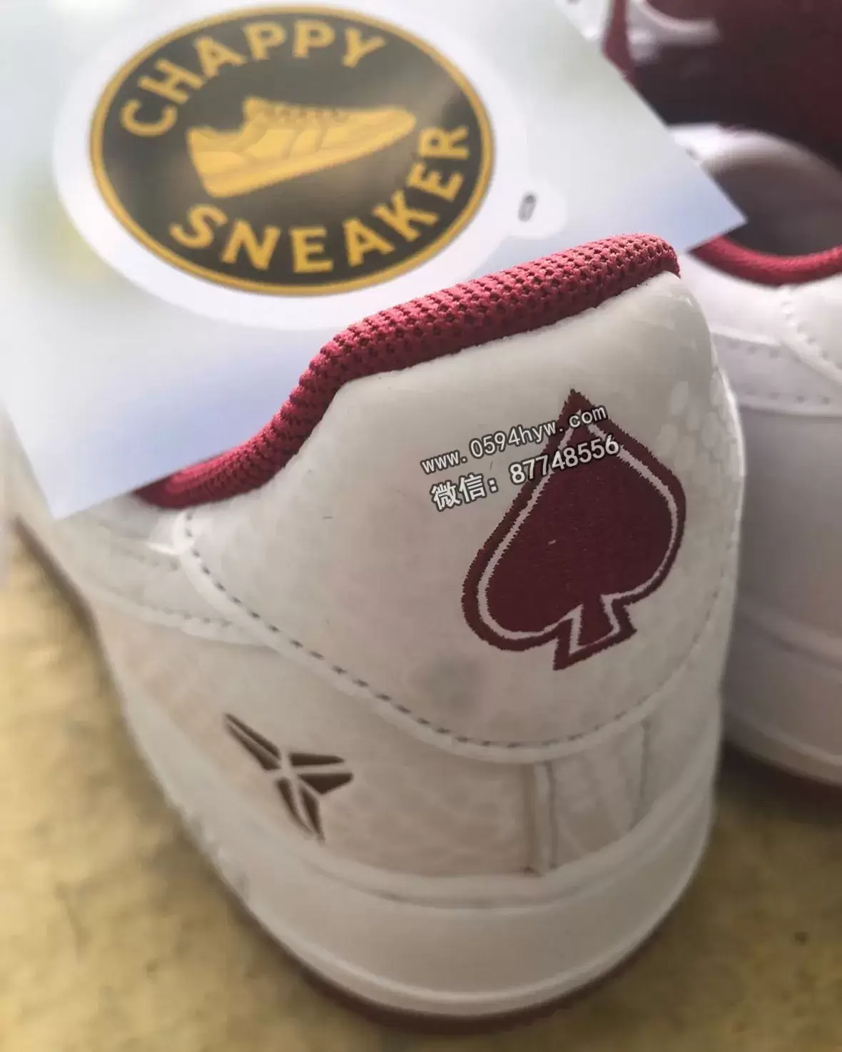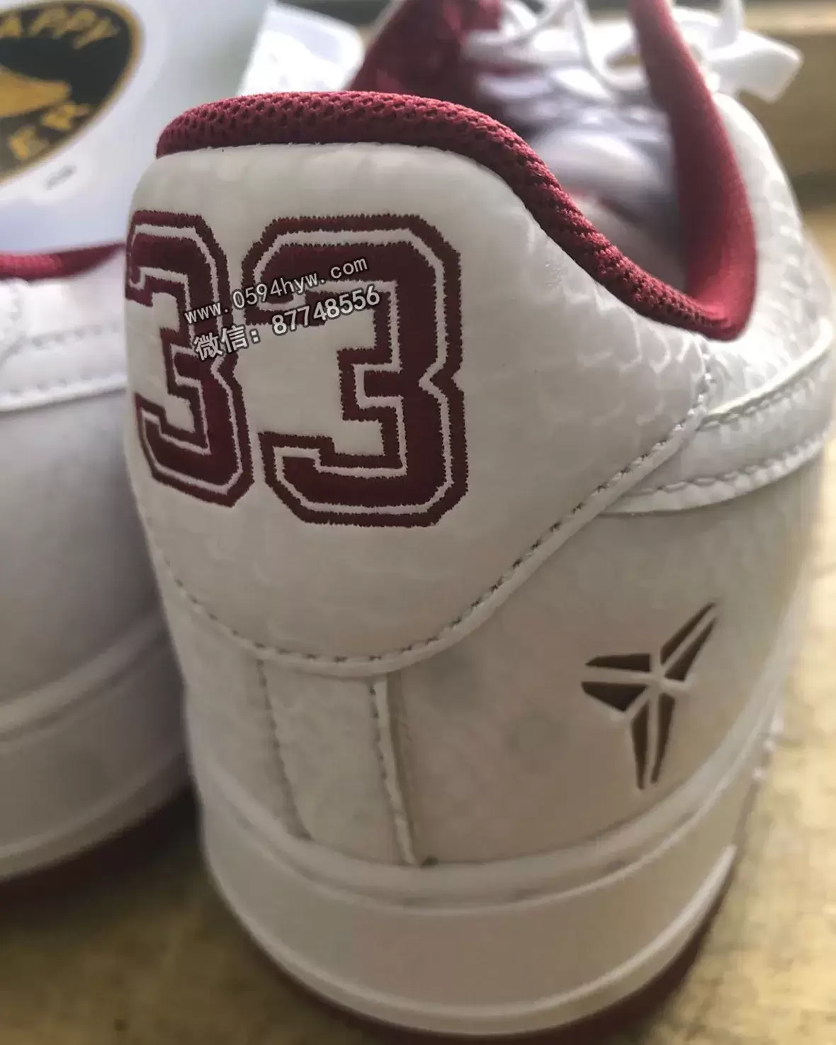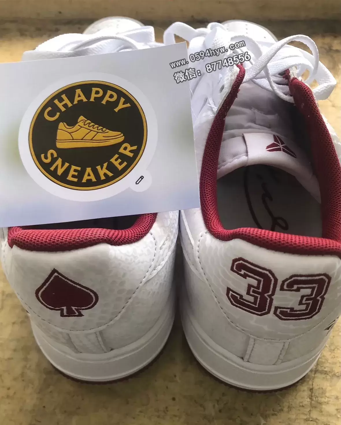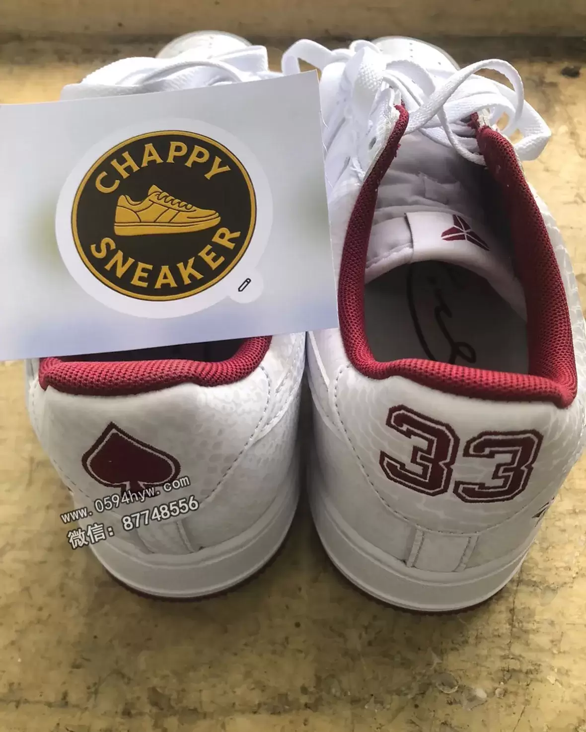 白色蛇皮纹理皮革鞋面代表了科比的 “曼巴 “精神,深酒红色点缀衬里和外底。鞋身处处彰显个人风格,包括后跟处绣有 33 号(科比高中时期的球衣号码),鞋垫和外底处绣有黑桃标志(科比的队徽)。在鞋跟和鞋舌附近还出现了科比的鞘状徽标,将这一故事与他后来的耐克生涯联系在一起。