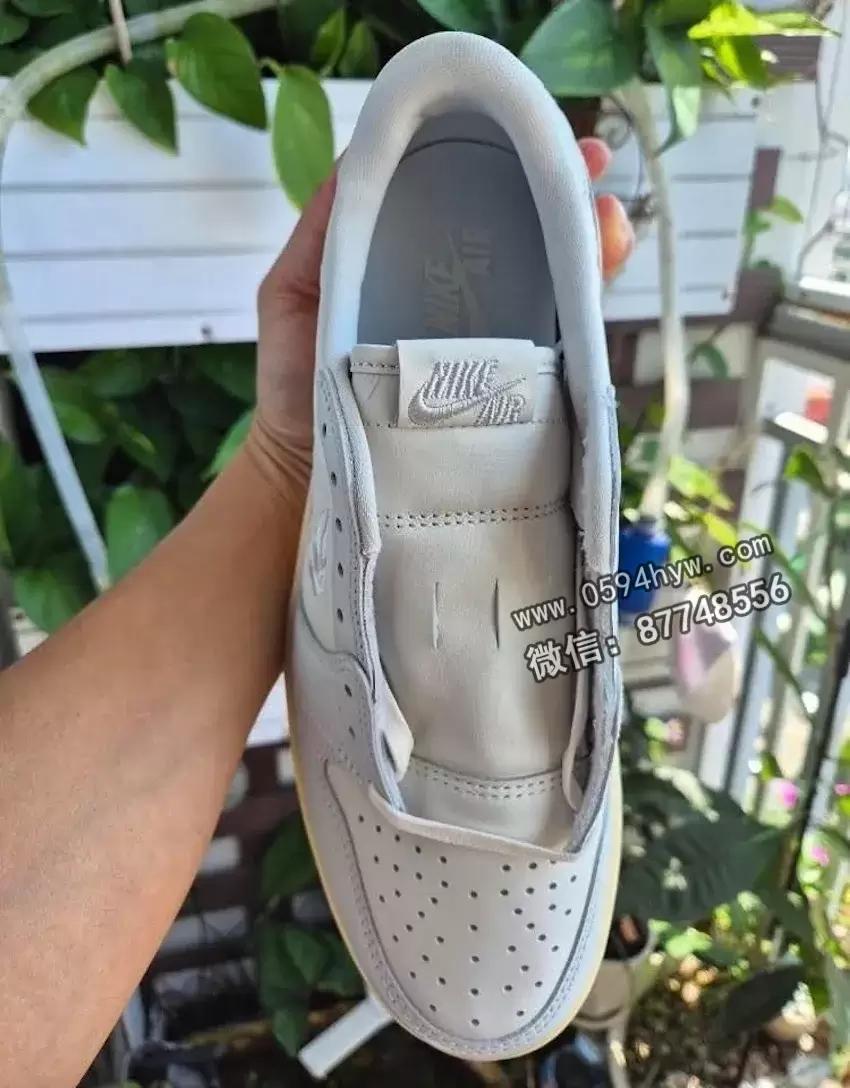 最引人瞩目的当然是鞋名中的花朵 Swoosh。两侧绣有独立的树叶、花朵和树枝,它们相互缠绕、重叠,甚至还融入了蝴蝶或天使翅膀的元素。这些图案层层叠叠地分布在每块面板上,形成了一种半透明的拼贴效果,与鞋面上的帆布基底皮革形成鲜明对比,与鞋面上的米白色覆层和鞋底下的半透明椰奶色鞋底形成鲜明对比。