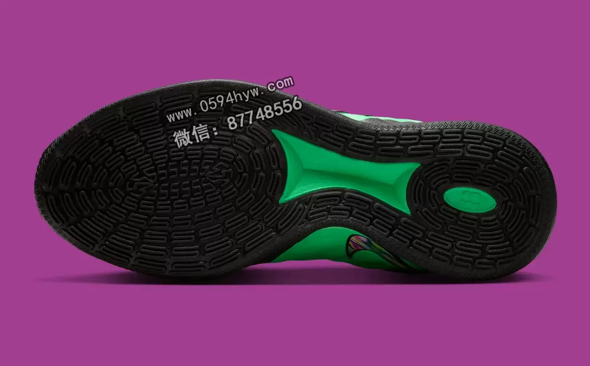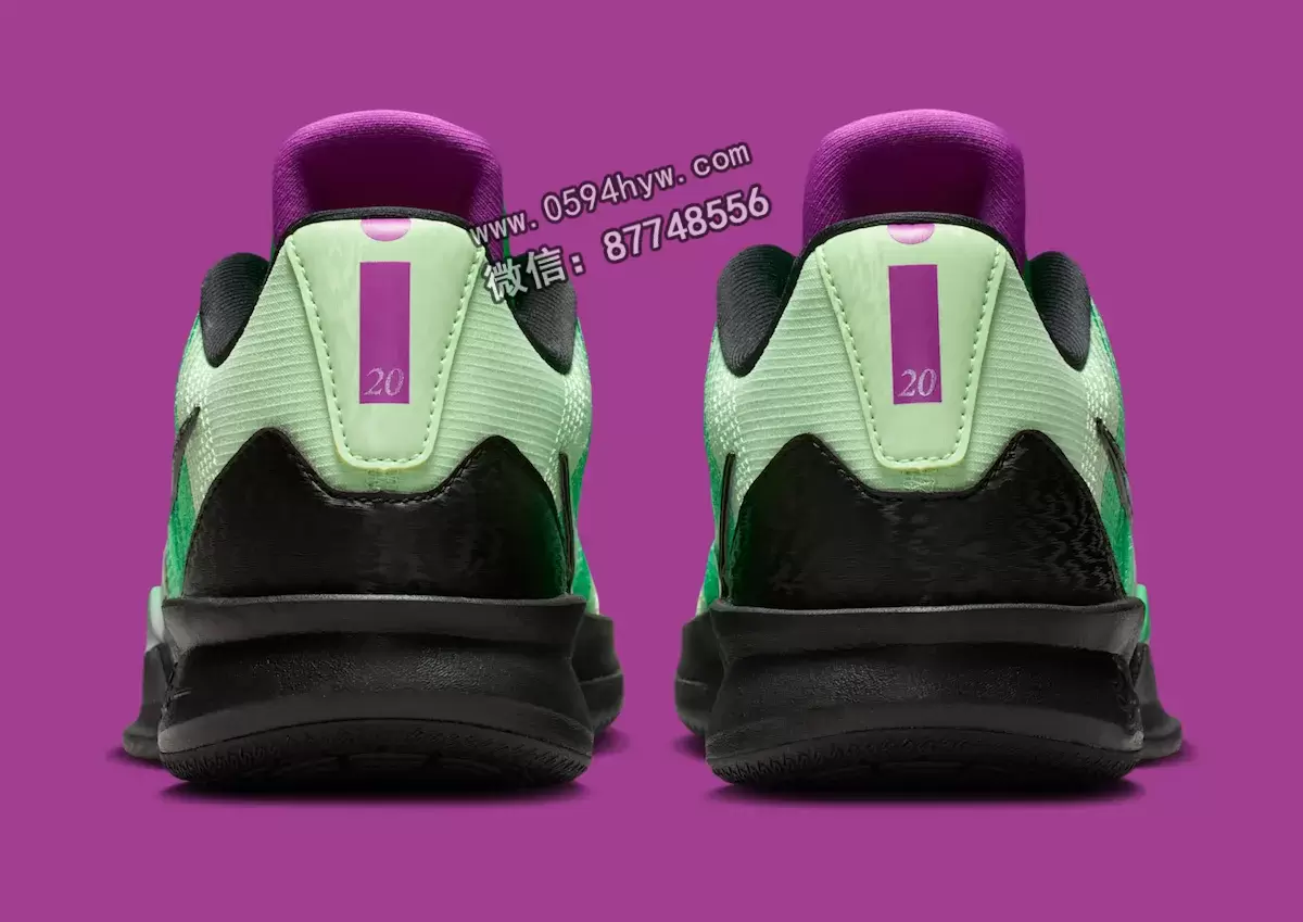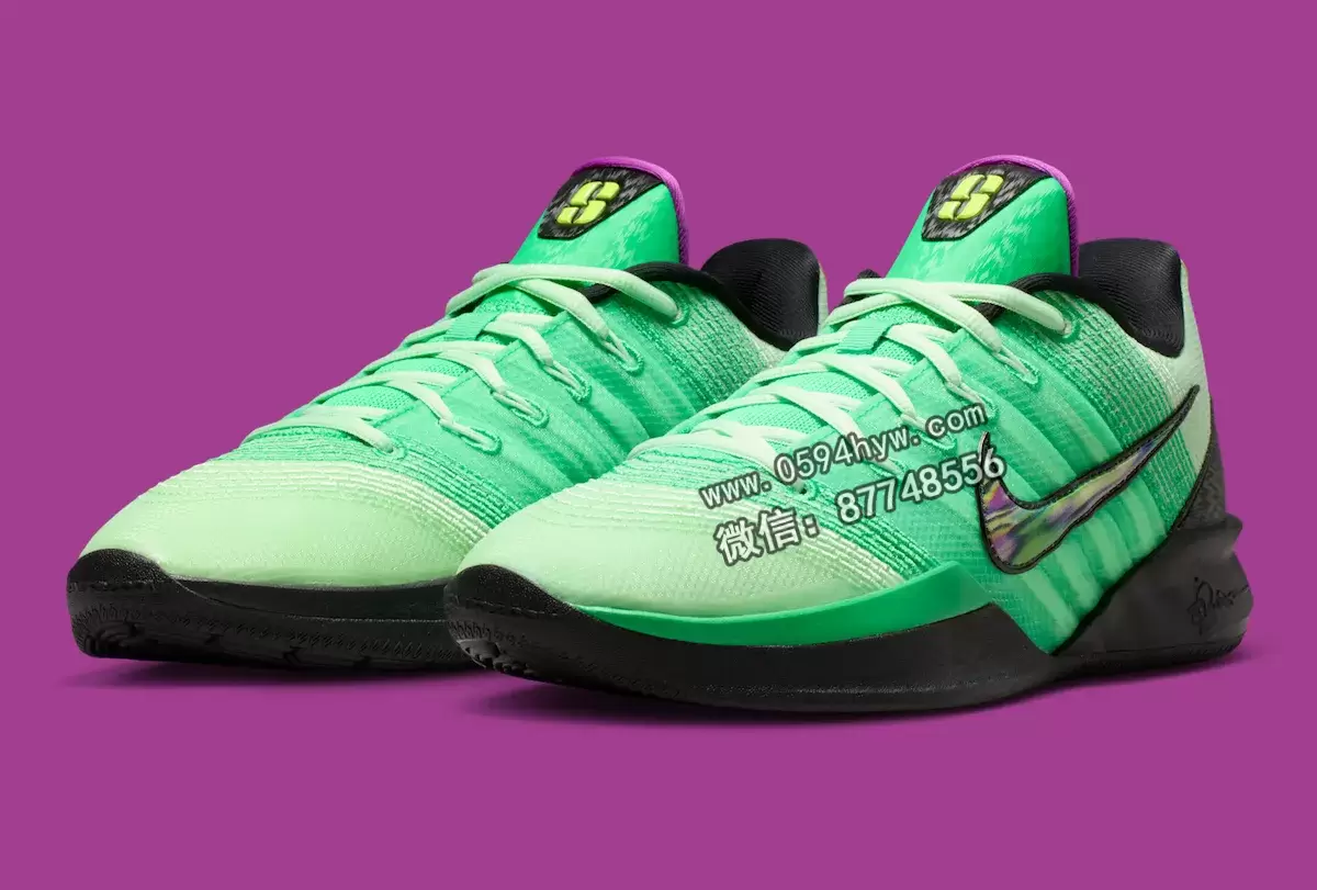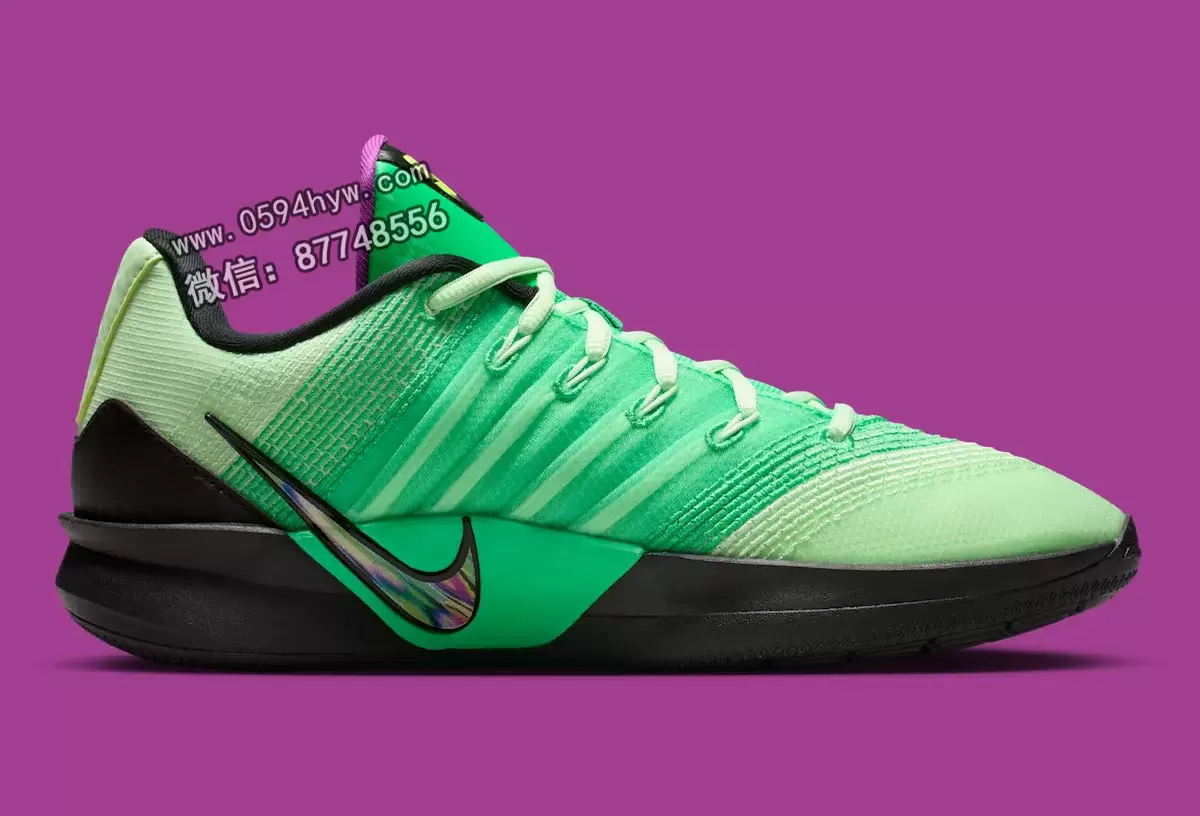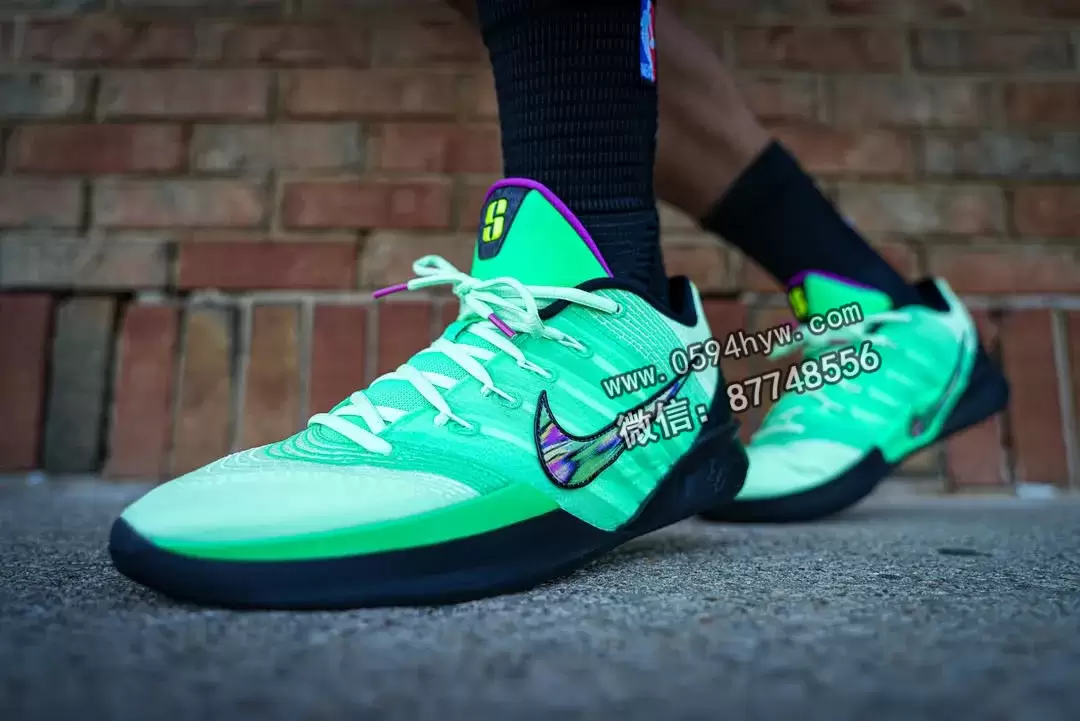 这款 Sabrina 3 变体鞋采用鲜艳的绿色网眼鞋面,轻盈透气,两侧饰有大理石花纹的多色 Swoosh。鞋舌内衬和后跟标签上也有紫色亮点,鞋舌上印有她的签名 “S “标志,标志着这是一款球员专属鞋款。鞋底采用黑色 Zoom Air 中底技术,提供灵敏的缓震效果,确保这款鞋在球场上也能表现出色。