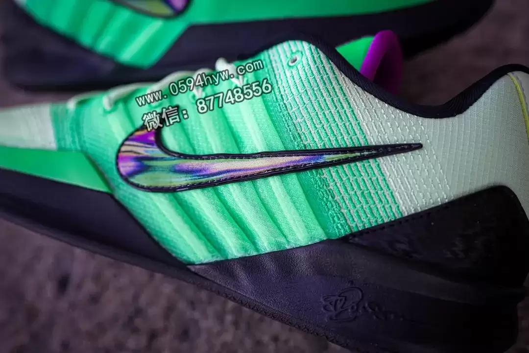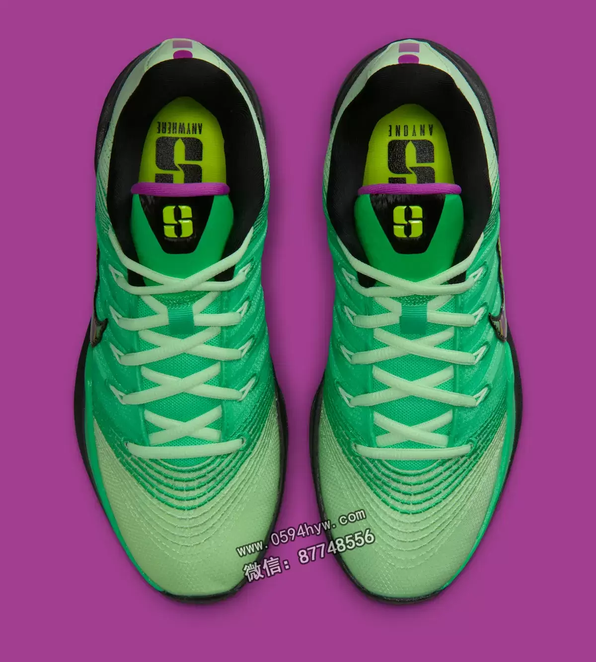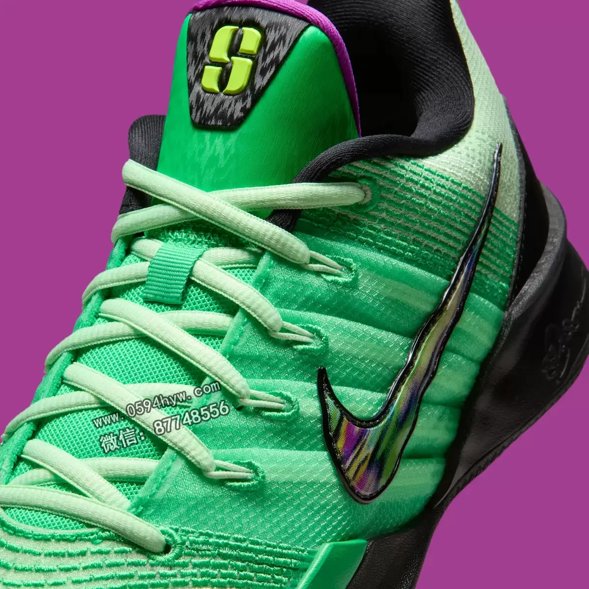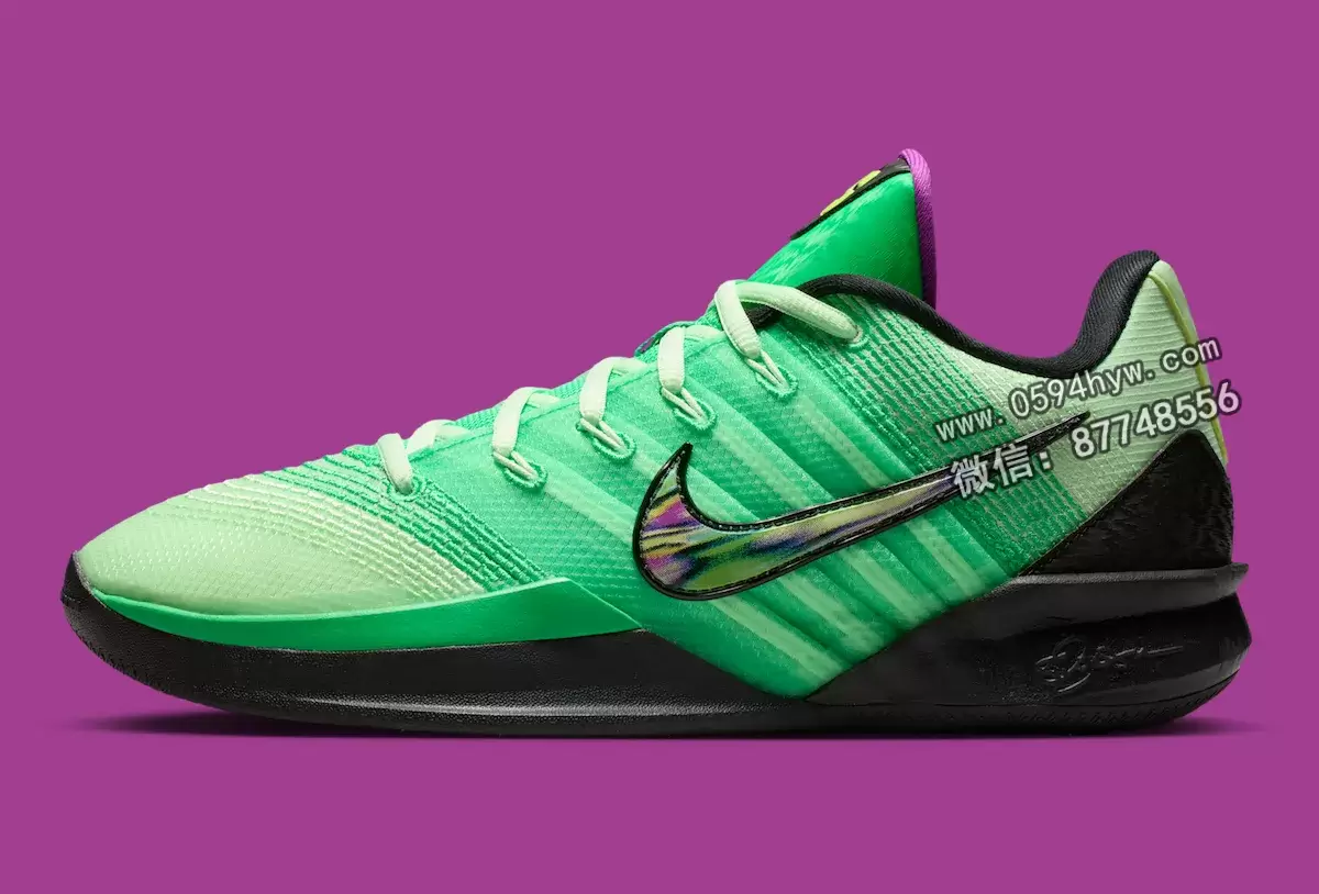 这款 Sabrina 3 变体鞋采用鲜艳的绿色网眼鞋面,轻盈透气,两侧饰有大理石花纹的多色 Swoosh。鞋舌内衬和后跟标签上也有紫色亮点,鞋舌上印有她的签名 “S “标志,标志着这是一款球员专属鞋款。鞋底采用黑色 Zoom Air 中底技术,提供灵敏的缓震效果,确保这款鞋在球场上也能表现出色。