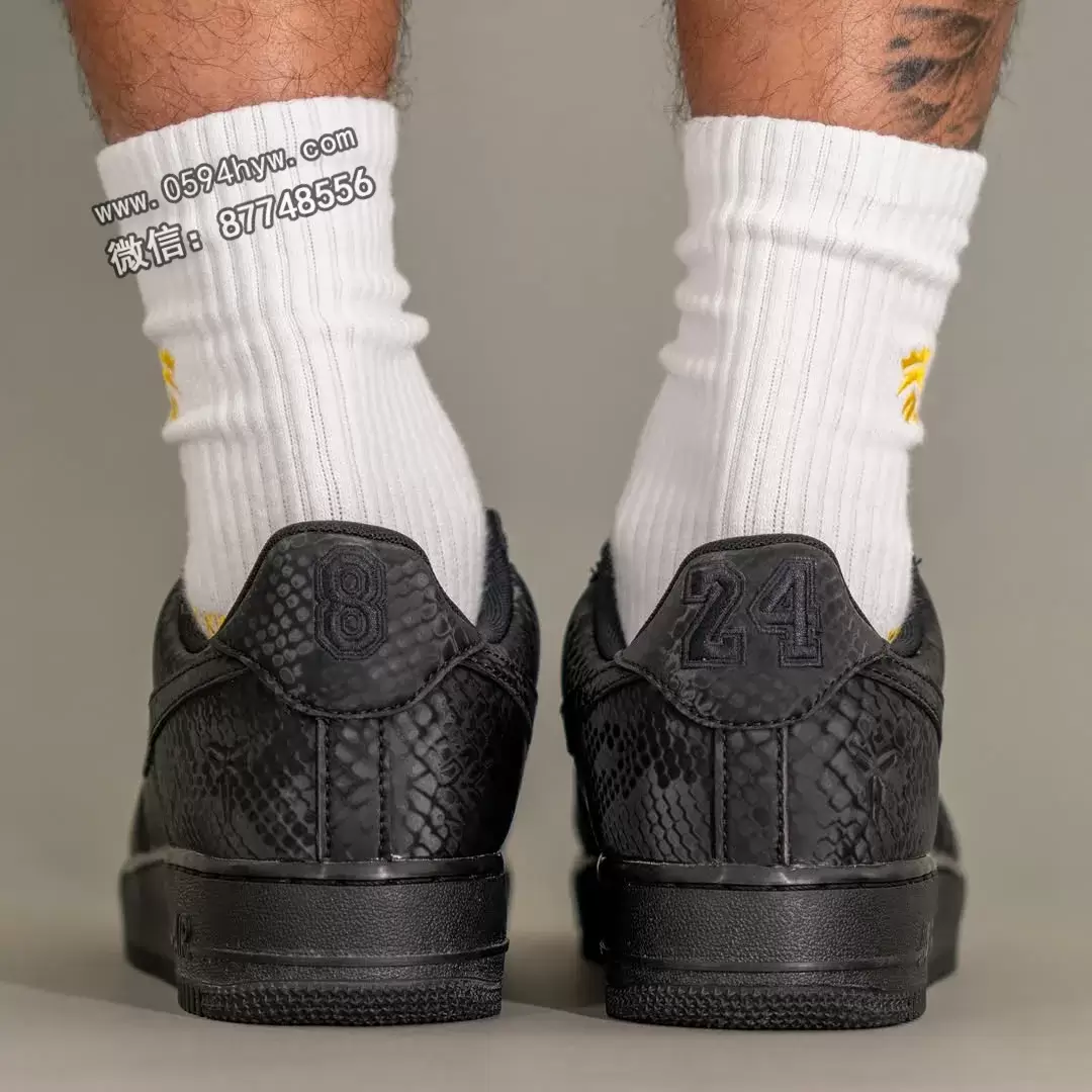 这是向布莱恩特致敬的四款配色之一,此外还有 “白色”、”紫色 “和 “卡其色”。新款球鞋以 Air Force 1 Low ’07 为基础,保留了生活方式元素,没有更新任何性能元素。鞋面采用仿蛇皮纹理,暗指布莱恩特的 “黑曼巴 “绰号来源于蛇,鞋舌上绣有他的标志性鞘状徽标。鞋身的后跟标签突出了他标志性的湖人队球衣号码 8 和 24。
