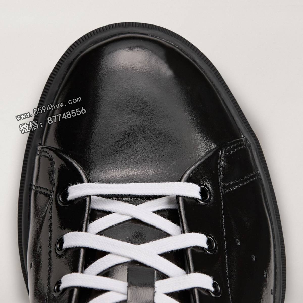 黑色哑光漆皮鞋面外观精致,将卡通奇思妙想与正装鞋的优雅气质融为一体。白色对比色鞋带和浮雕海绵宝宝标志等极简细节让人感觉轻松惬意。鞋面上的穿孔则体现了运动鞋爱好者长期以来对 Stan Smith 鞋款的推崇。