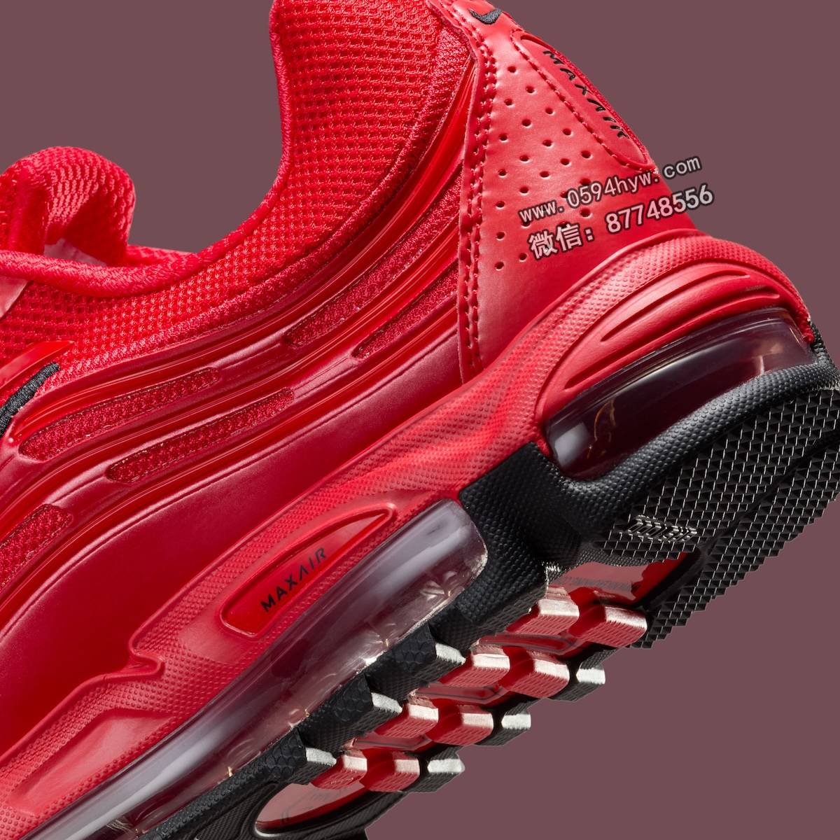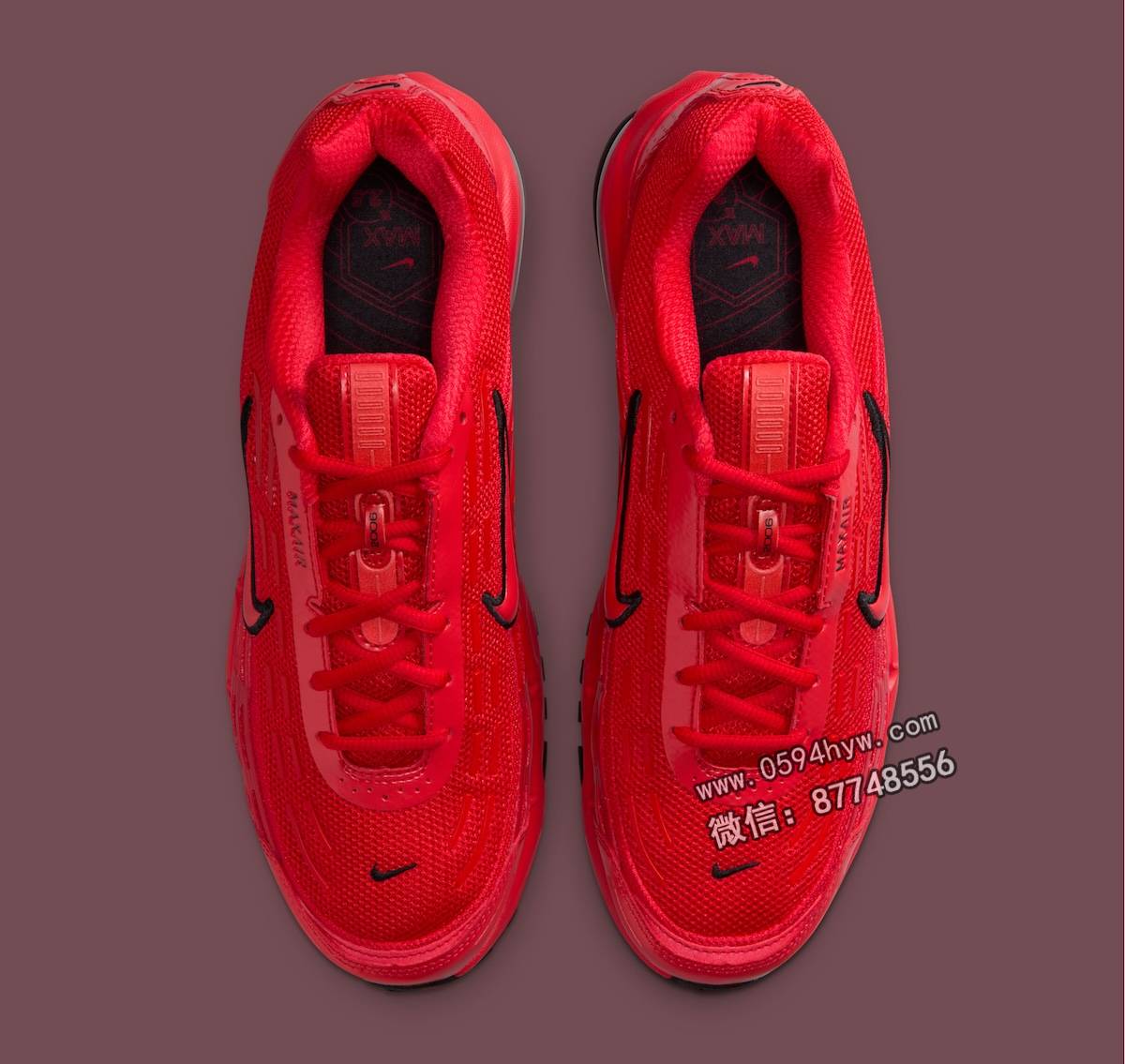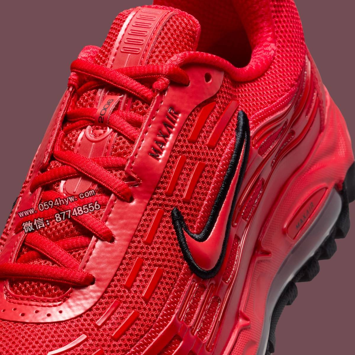 这双鞋以单色的大学红为基调,整个网眼鞋面都是红色,鞋面上还有亮面覆盖。