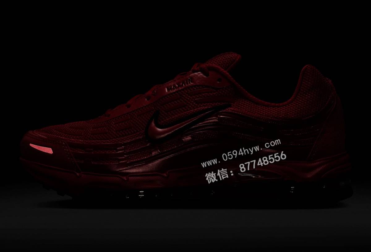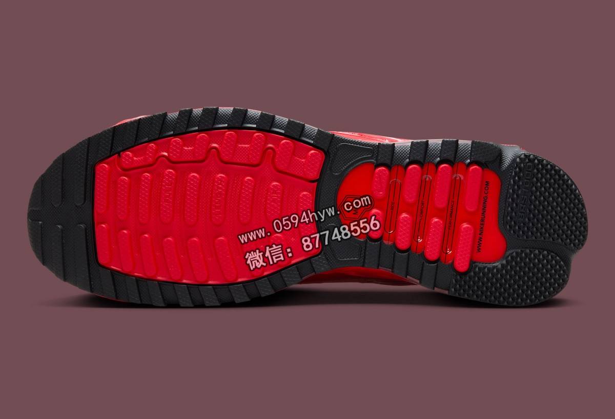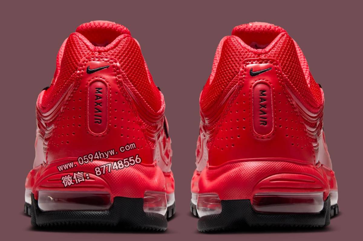 Swoosh 和外底的黑色细节与鲜红色帆布形成鲜明对比。该配色也让人回想起 2010 年代中后期耐克运动鞋的红宝石色配色,为设计注入了一丝怀旧气息。可见的气垫和多层纹理使这款运动鞋兼具经典风格和年轻优势。