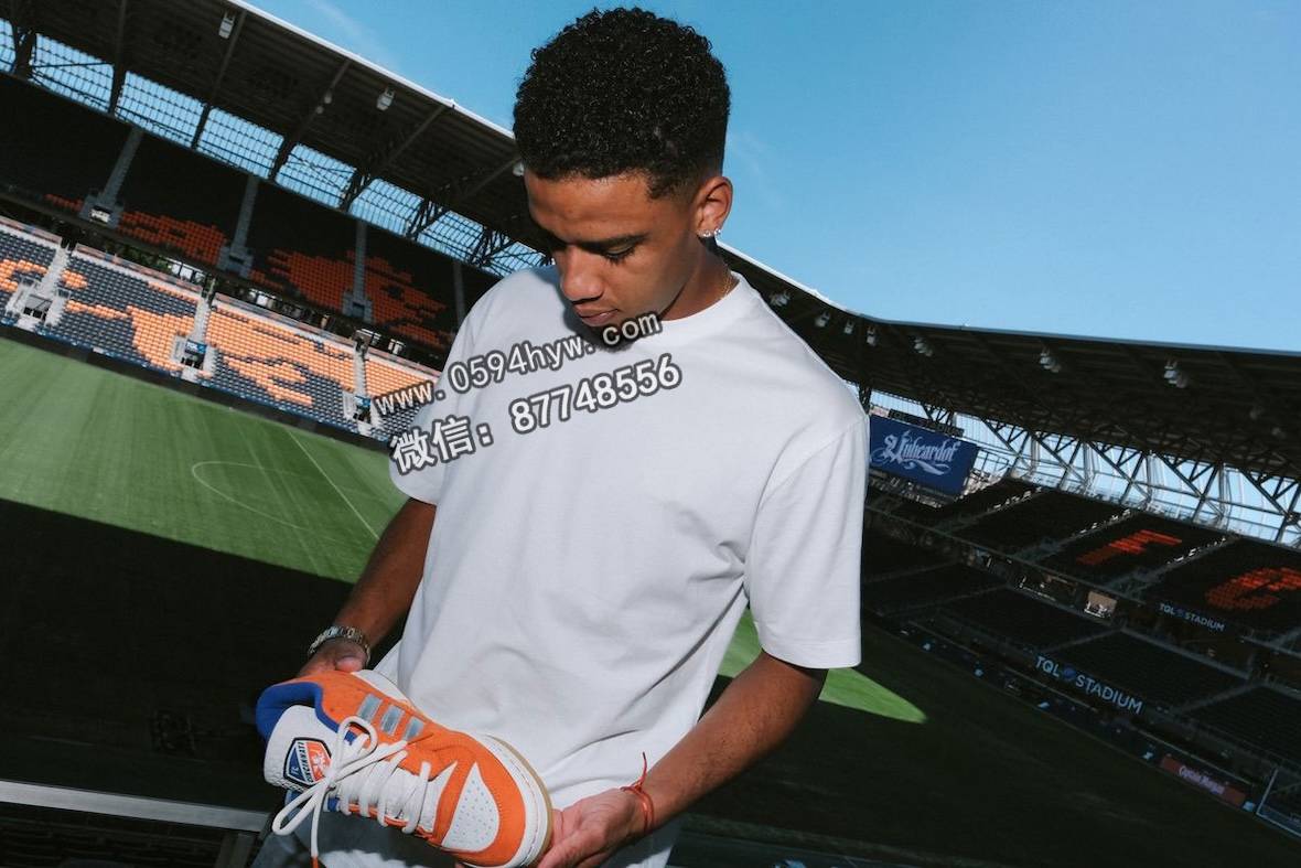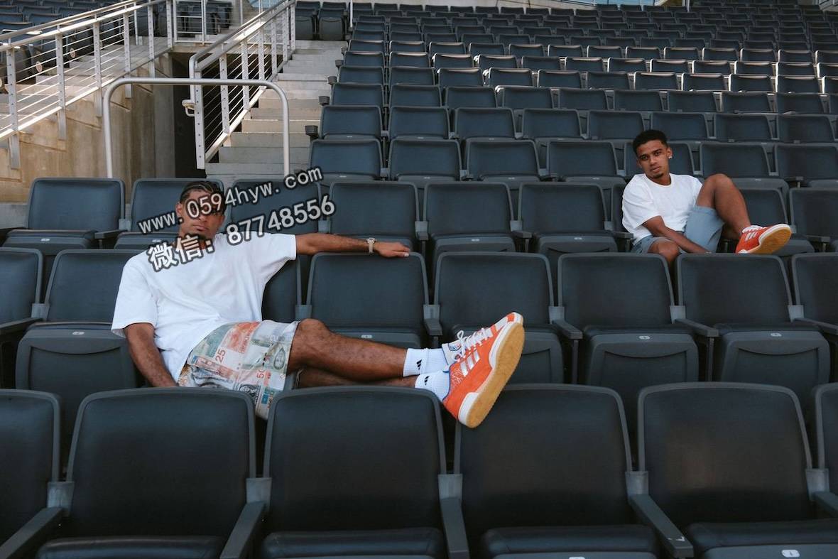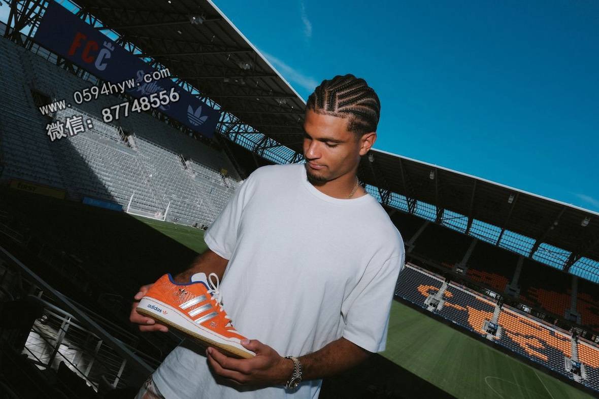 橙色麂皮搭配银色三条纹,鞋舌上印有辛辛那提俱乐部的队徽,鞋跟上绣有 “All For Cincy “字样。蓝色内衬和胶底是这款鞋的点睛之笔,而定制鞋垫上的醒目图案则与此次合作的整体主题 “当地自豪感 “相得益彰。