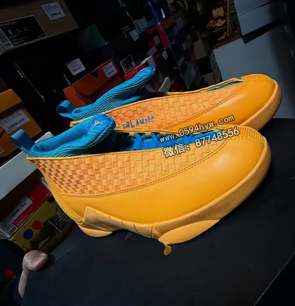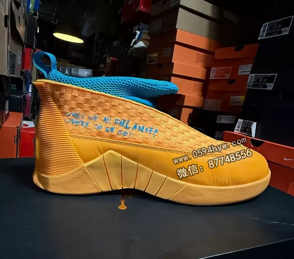 与 2021 年的 “米色 “乔丹 15 相反,这双鞋采用了芥末黄色皮革,鞋舌、内衬和拉环上有对比鲜明的编织纹理和生动的蓝色细节。鞋侧外侧有比利的手写签名:”当我们都睡着了,我们会去哪里?“,直接引用了她的第一张专辑。
