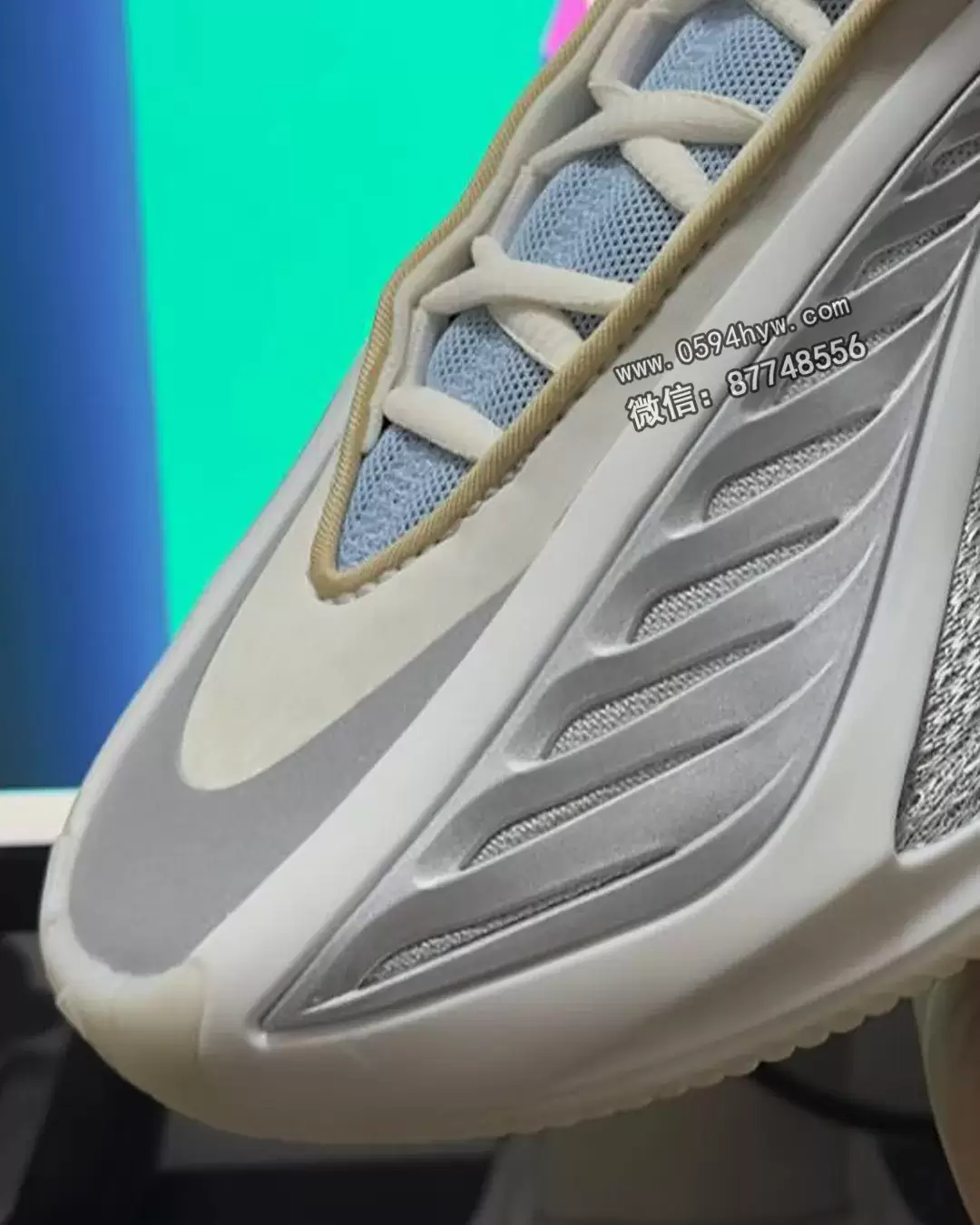 这双鞋的配色方案以金属银、棕褐色和婴儿蓝为主色调,并以金色饰边点缀,彰显优雅和精致。鞋身两侧为银色网眼面板,搭配反光细节和奶油色包边,形成视觉对比。鞋舌上缝制有金色的马徽,向农历新年和马所代表的力量、自由和雄心致敬。