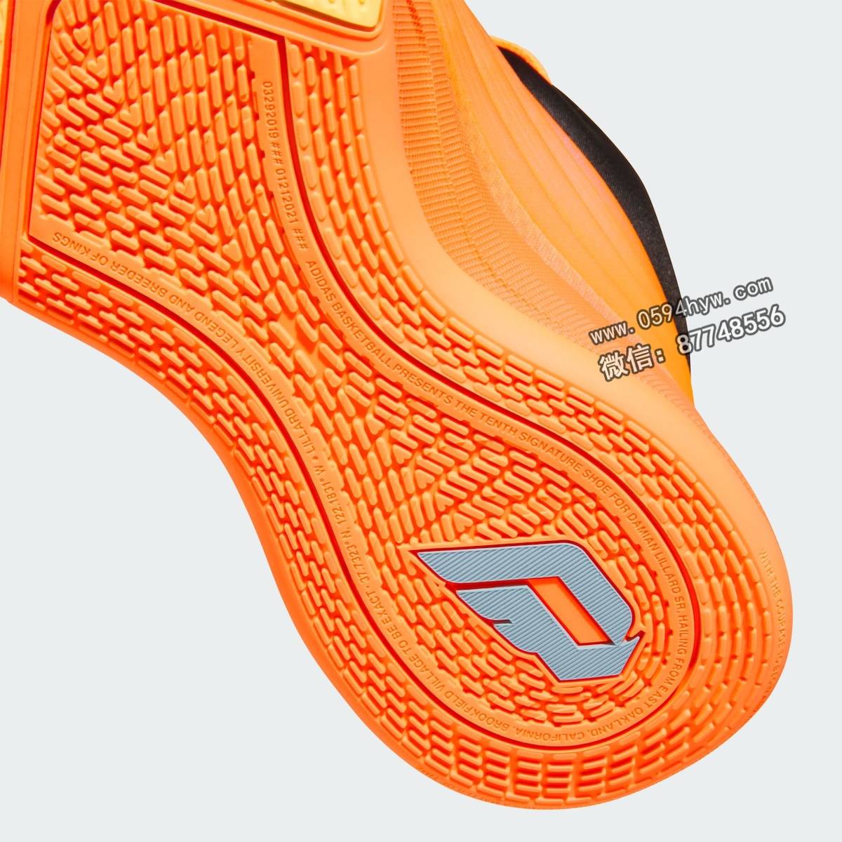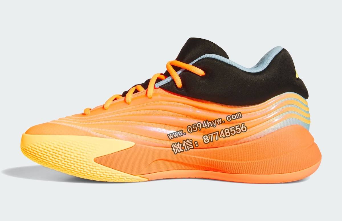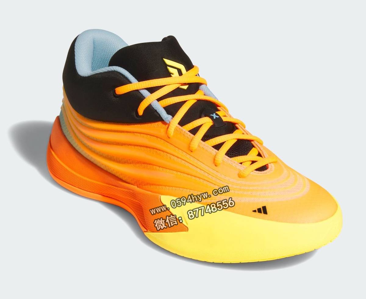 该鞋的性能特点包括阿迪达斯的 Lightstrike 缓震技术和底部装载的 Y 形柄板。外底为橙黄色牵引图案,前脚掌处印有 Dame 自己的 “D “标志。