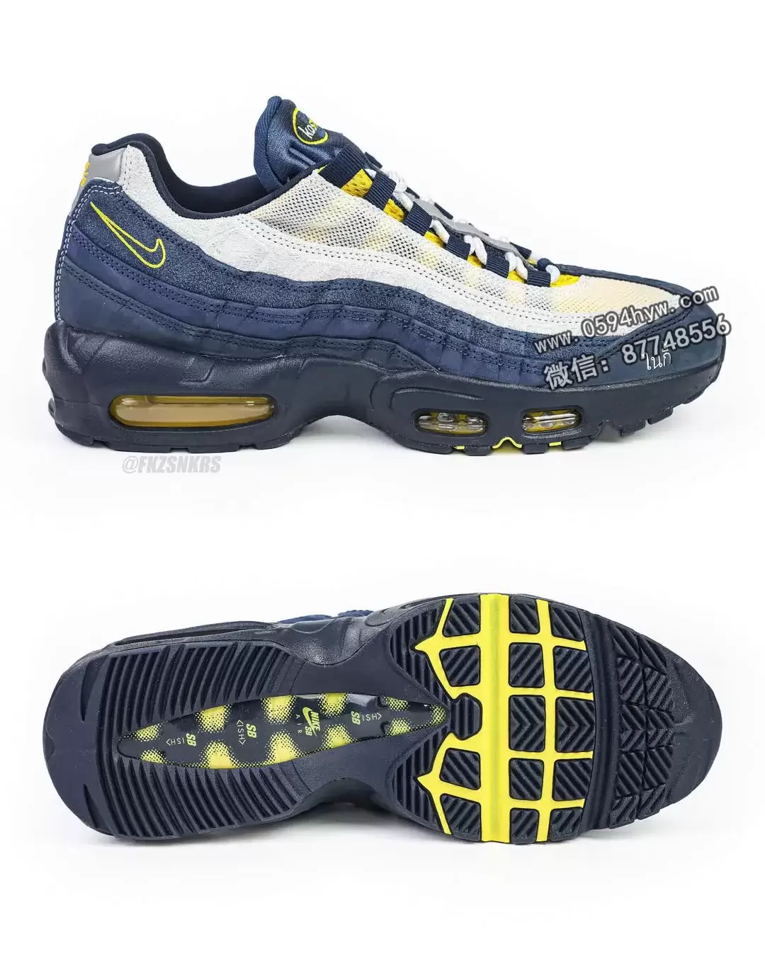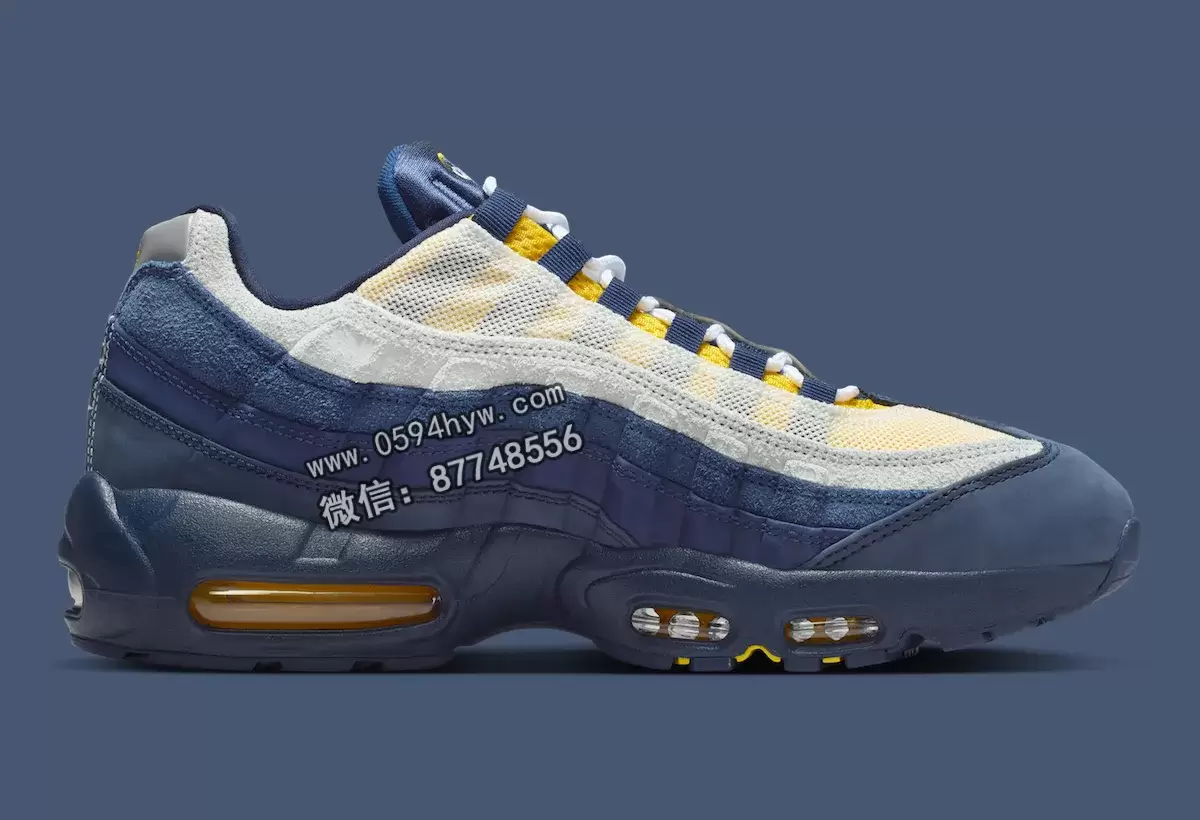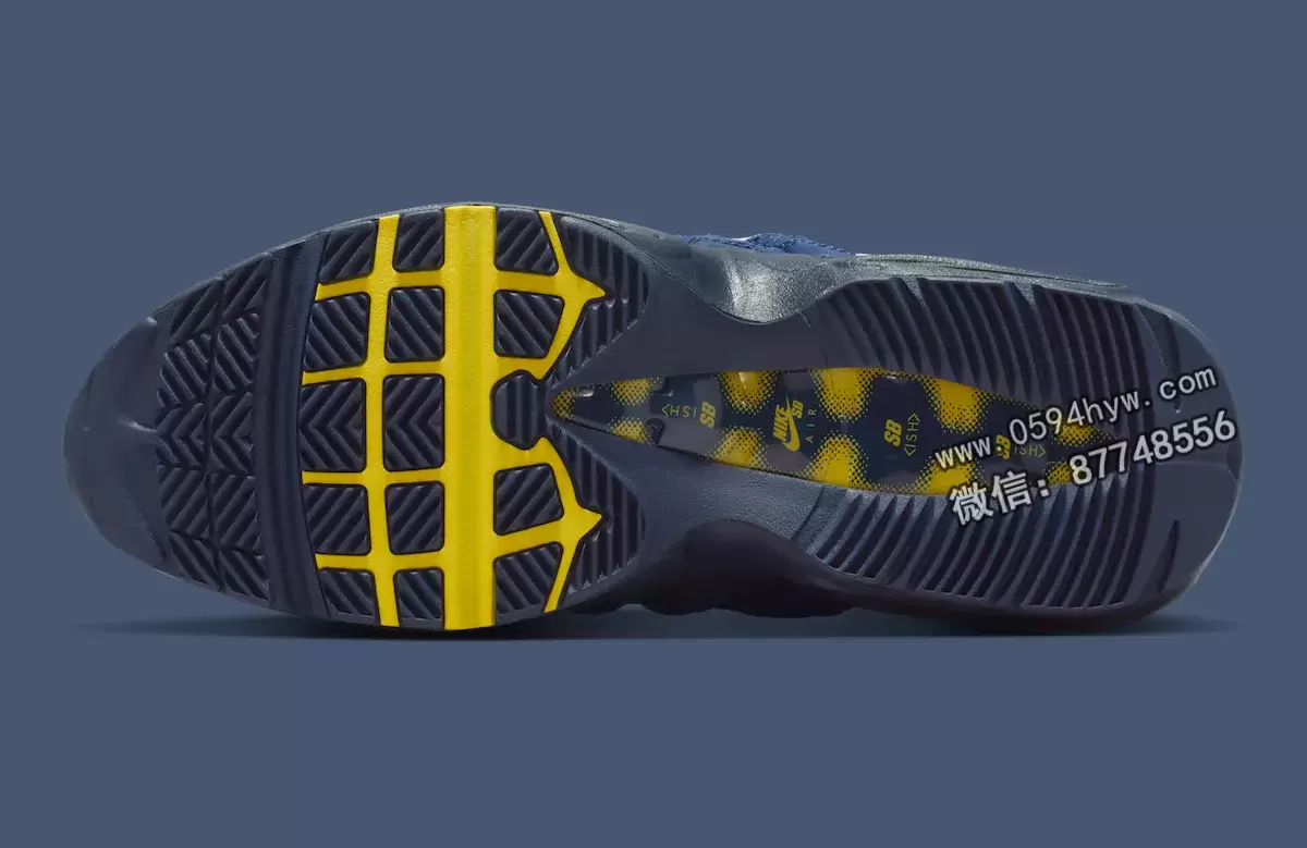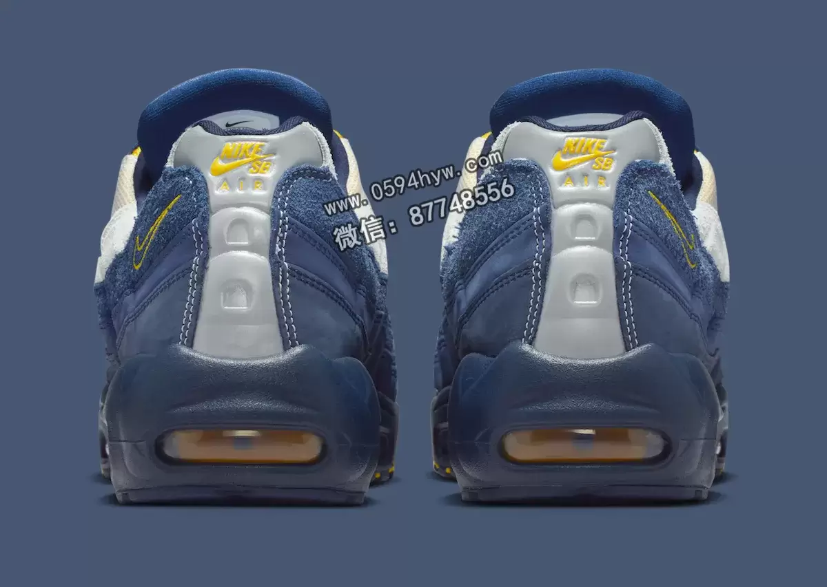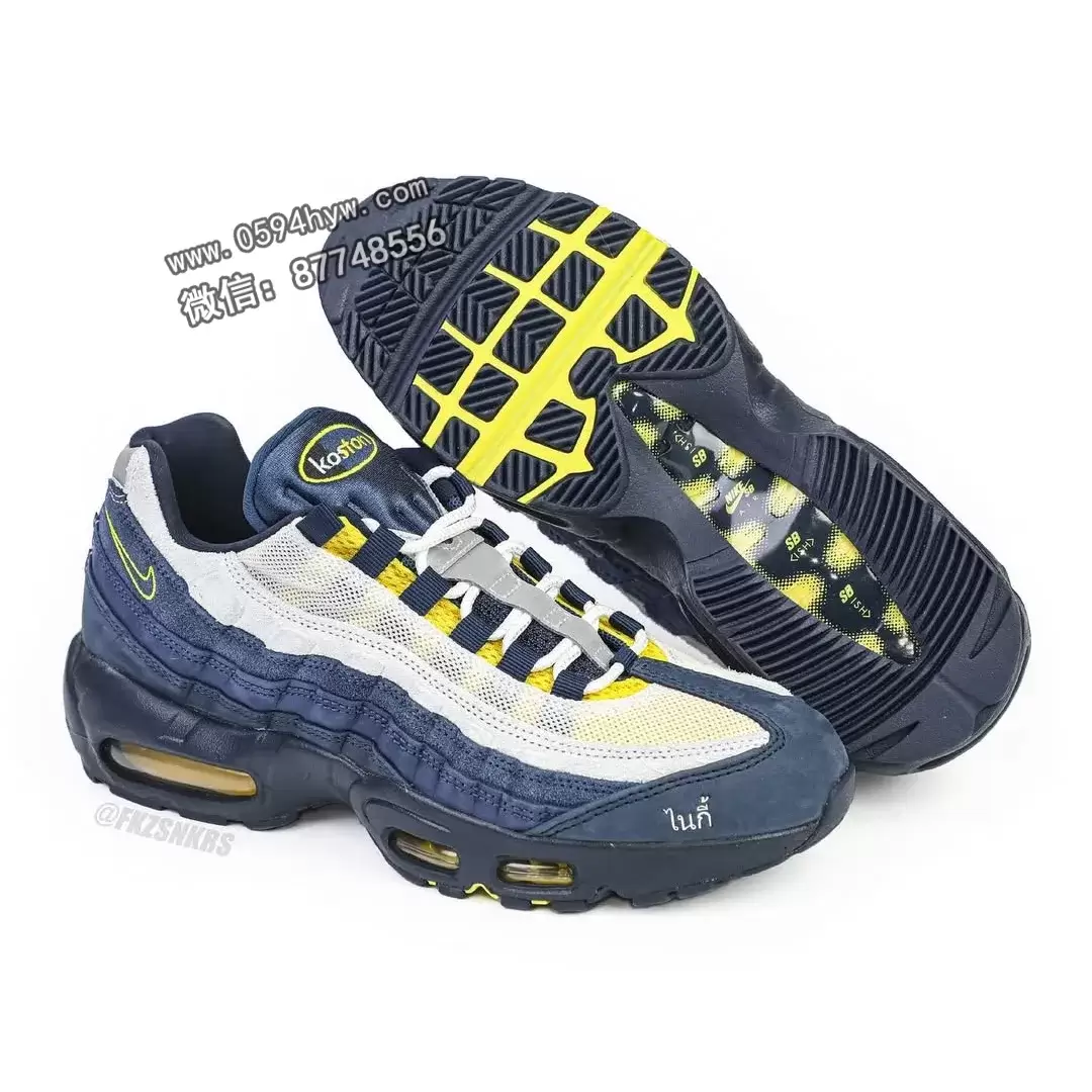 更新 10/21/25:下面是 Eric Koston SB Air Max 95 的官方照片,鞋头有泰文字母,鞋舌上有 Koston 的名字。海军蓝和黄色的设计与密歇根州的颜色相呼应,并配有复古霓虹色的 Air Max 鞋垫。预计将于 2025 年 11 月发售。敬请关注更多更新。