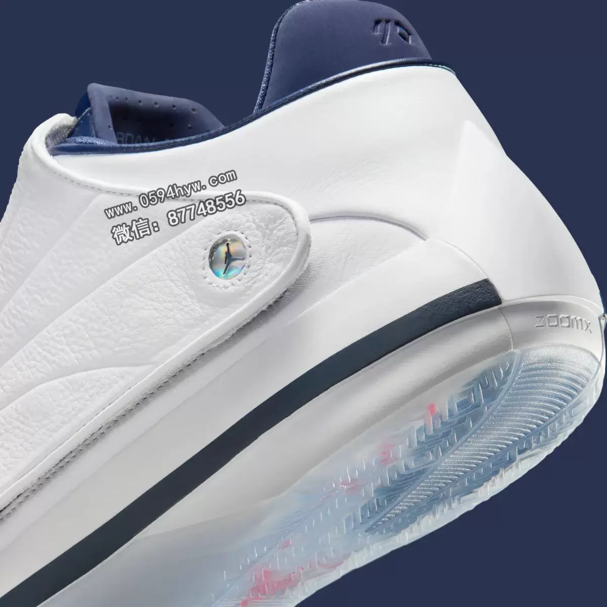 这款 AJ41 的结构才是真正有趣的地方。光亮的海军蓝漆皮鞋头与优质的白色皮革鞋面相得益彰,外观既以传统为中心,又不失精致。可拆卸护罩是这款设计中较为 “前卫 “的元素之一,其透气网布底层让人联想到 OG AJ16。下方的半透明冰面外底采用了从 AJ16 上借鉴的一些额外的牵引细节,并将其与现代科技相融合。