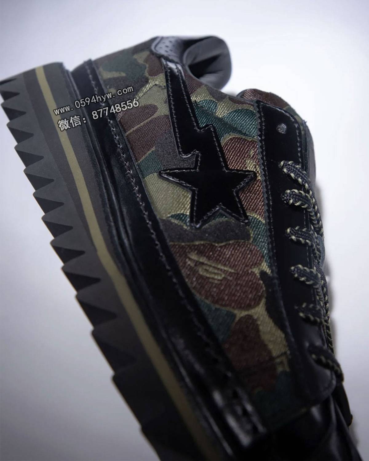 右侧鞋身采用了 BAPE 著名的 ABC 迷彩印花,而左侧则以 CLOT 的 Silk Royale 图案为主。运动鞋采用优质皮革、哑光黑色鞋带锁和波纹外底。包装与球鞋本身一样高档。一对黑色和橄榄色混合的货色鞋带完善了细节,增加了定制选项。