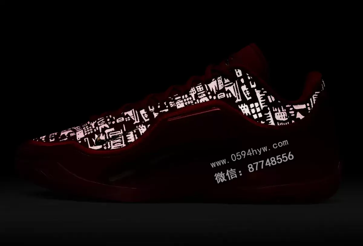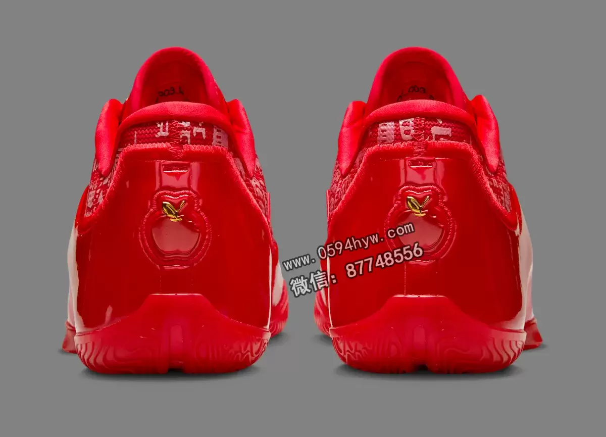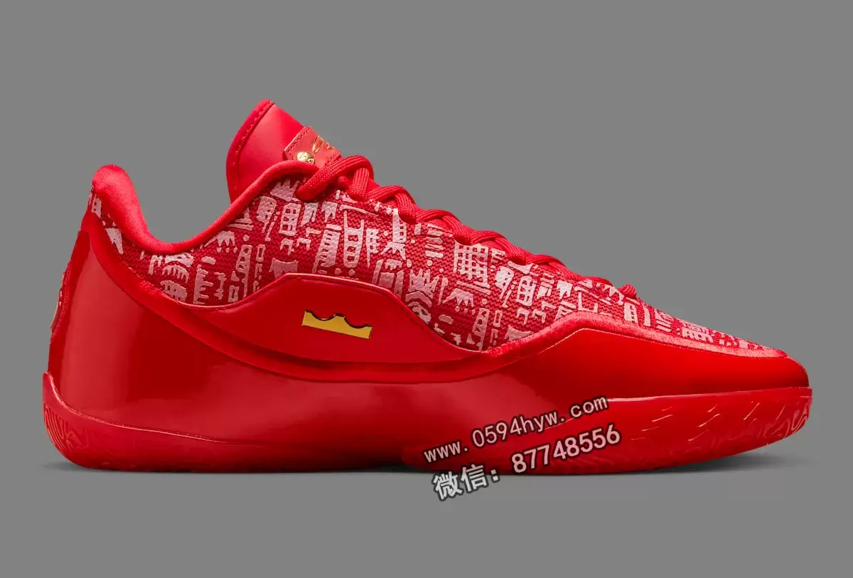 这双鞋的配色就很能说明问题。这双球鞋完全采用大学红配色,其复杂的反光图案灵感来自勒布朗职业生涯的里程碑。手绘的王冠设计是对他 “詹皇 “绰号的致敬,而鞋跟上咬了一口的苹果标志则是指纽约,也就是詹姆斯被选中并改变其职业生涯轨迹的 “大苹果”。Swoosh 上的金色装饰和勒布朗在鞋舌上的签名增添了王者的奢华气息。