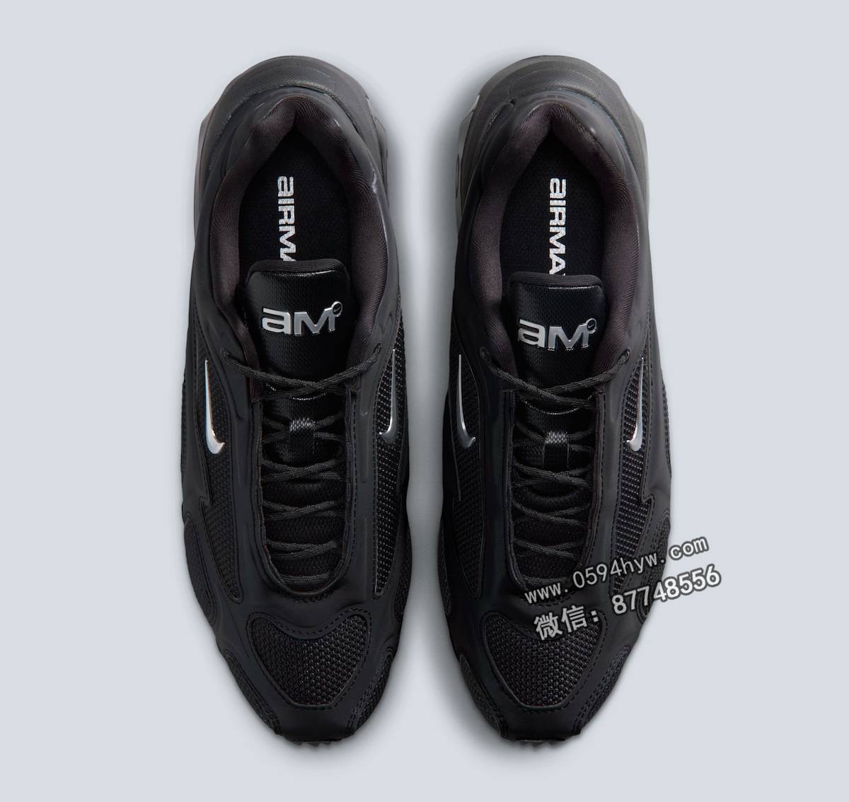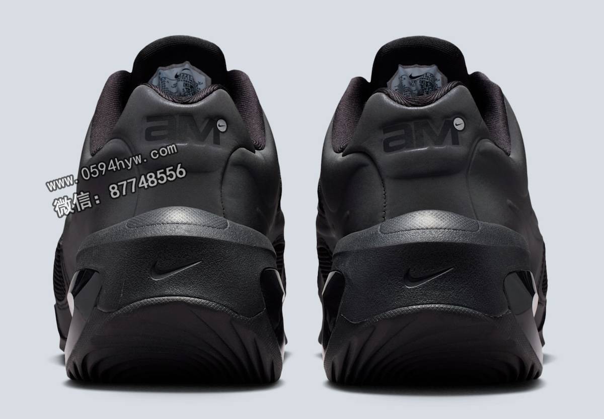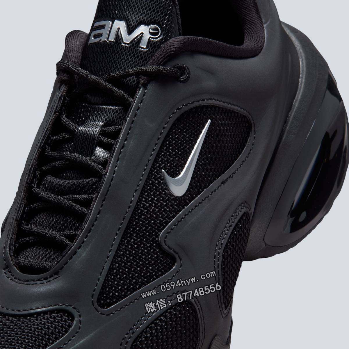 鞋面为黑色网眼布,外覆塑形合成材料。金属银色迷你 Swooshes 和 “am²”品牌标识向 Air Max 系列的历史致敬。脚下的超大可视 Air 单元在提供缓震效果的同时,还增添了大胆的流行色。
