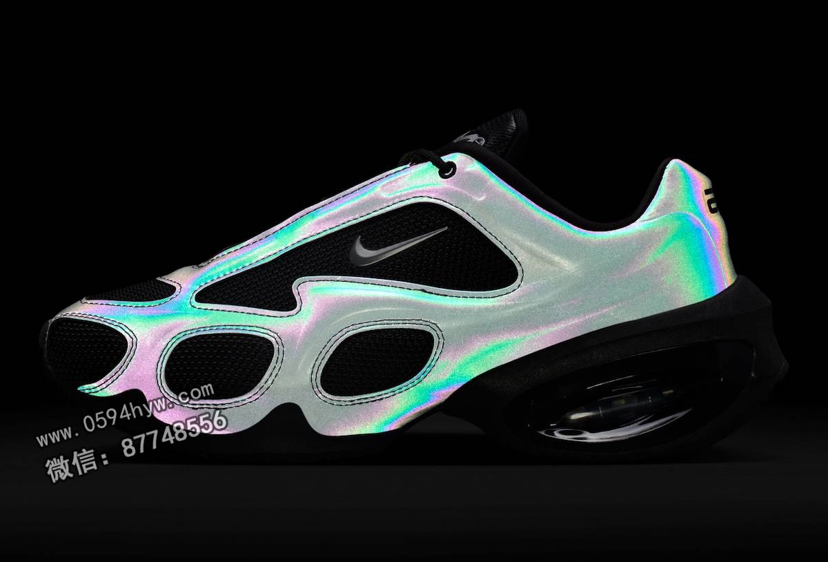 直接照射,鞋面上的彩虹色反光板会呈现出动态的色彩变换。对于运动鞋爱好者来说,这是一个微妙而非凡的细节。这款鞋的设计融合了 Air Max 系列的简洁现代风格和未来主义美学。