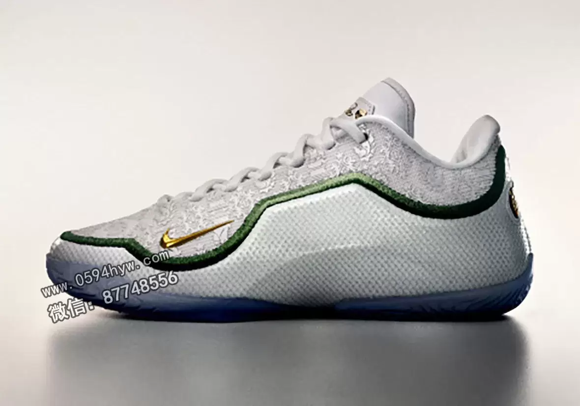 这款球鞋有白色、球场绿、浅烟灰和黑色四种颜色,与勒布朗的圣文森特-圣玛丽高中校服颜色相呼应。鞋跟处缝制有金色的 “Chosen 1 “徽章,暗指勒布朗在这一历史性头条新闻刊登几天后所做的纹身。花卉提花图案和冰霜外底等细节的巧妙点缀,为这款球鞋画上了圆满的句号。