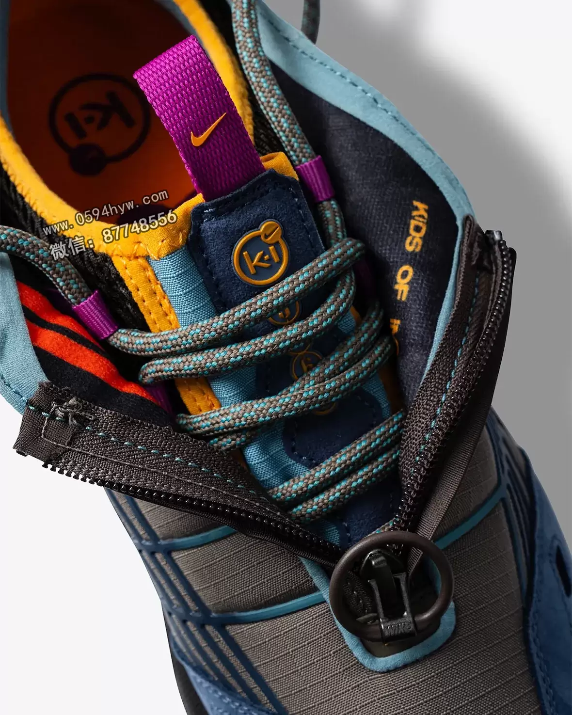 这款 Sunder 独家鞋款的设计与零售鞋款如出一辙,但色调更为柔和–鞋面为混凝土天空色,鞋笼为散射蓝,鞋身则以鲜艳的黄色和粉色点缀。KOI 品牌标识和绳索鞋带为鞋款增添了低调的自信。