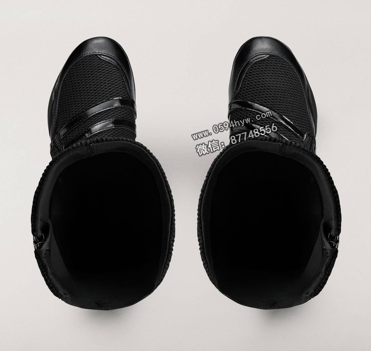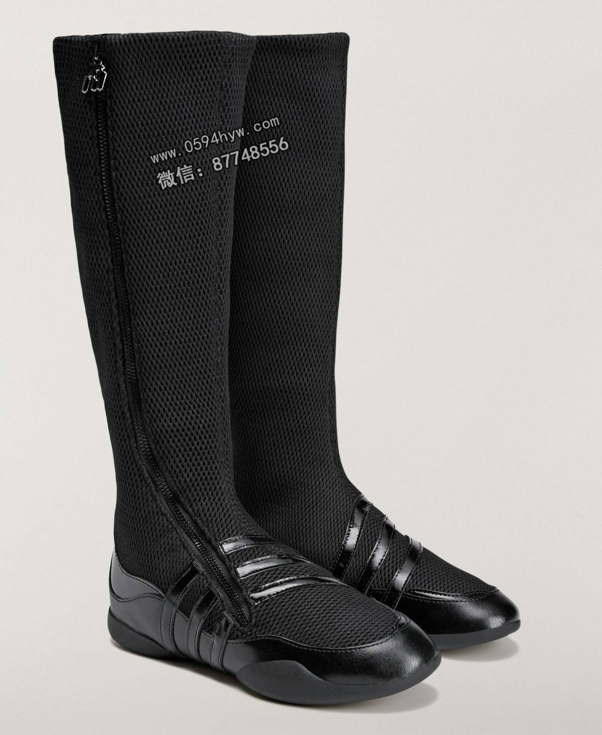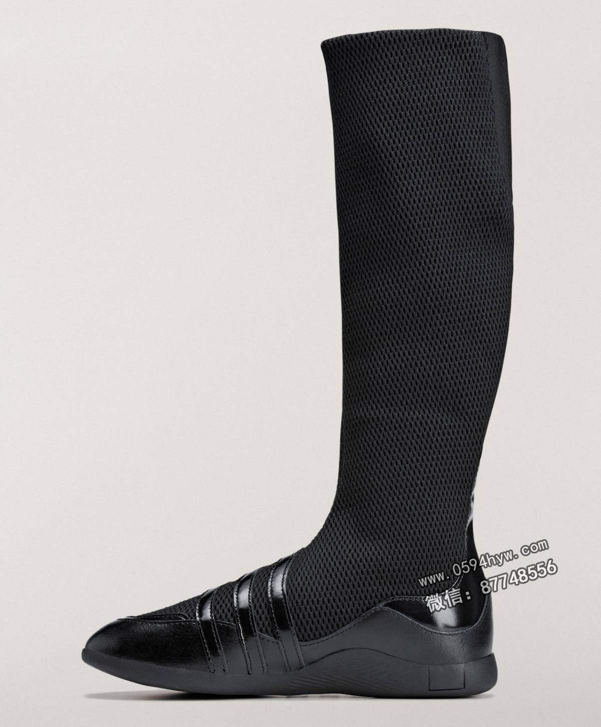 两款鞋分别采用了适合健身的薄鞋底。首先是黑色小腿高筒靴,用透气网眼布代替皮革,并用漆皮勾勒出轮廓。