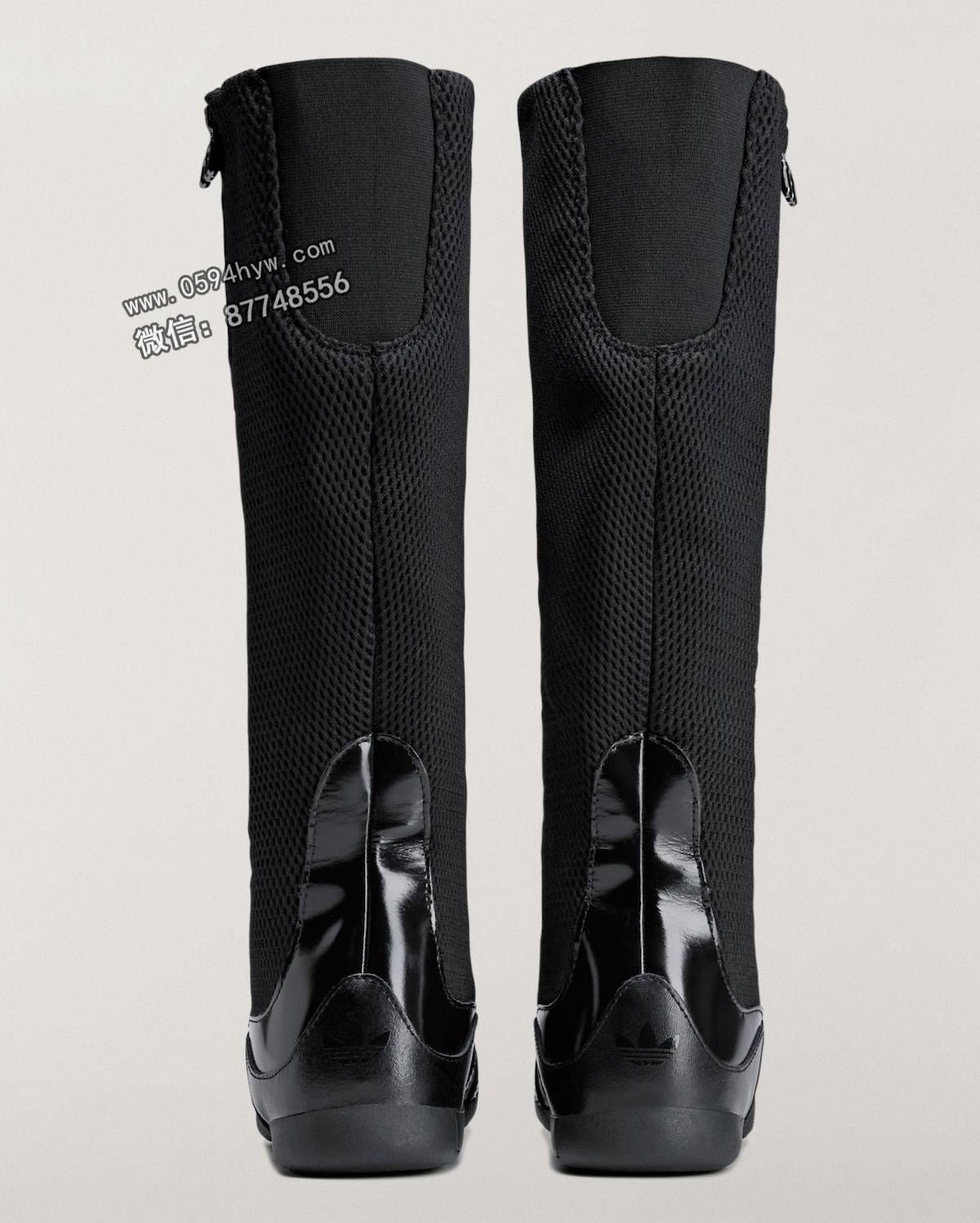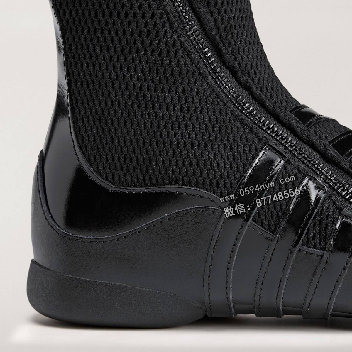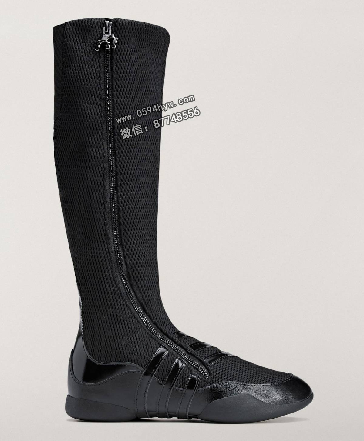 两款鞋分别采用了适合健身的薄鞋底。首先是黑色小腿高筒靴,用透气网眼布代替皮革,并用漆皮勾勒出轮廓。