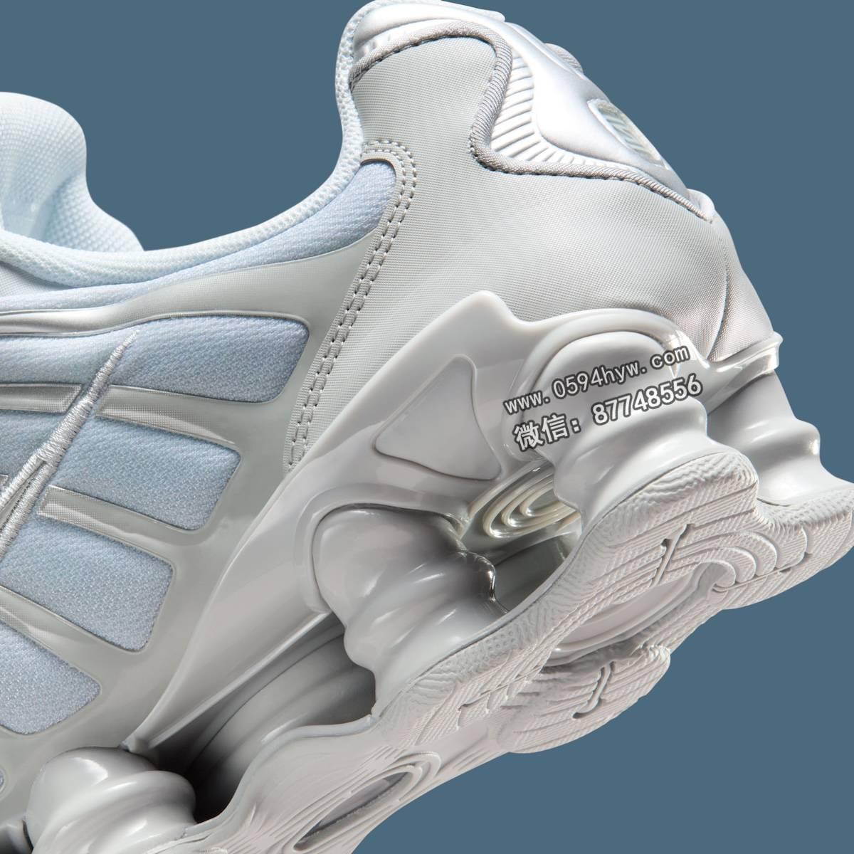 低调的铂金网眼鞋面泛着婴儿蓝的光泽,提供了透气的结构。金属银色点缀着 Swoosh、鞋跟和鞋舌标签,在关键细节上点缀出浓重的千年性能感,这正是 Shox 最初的风格。