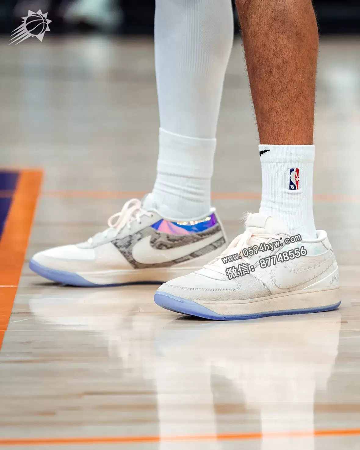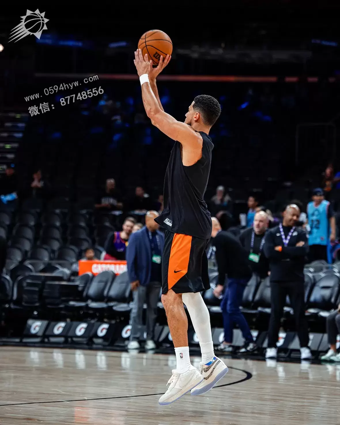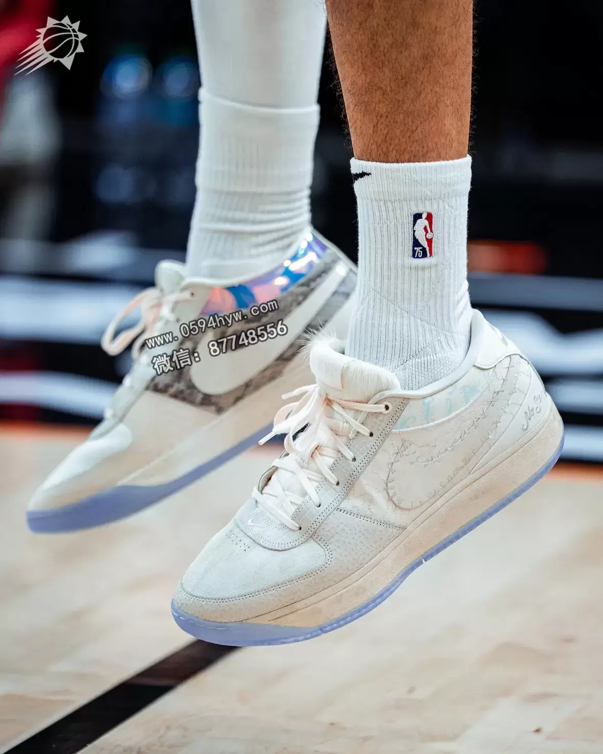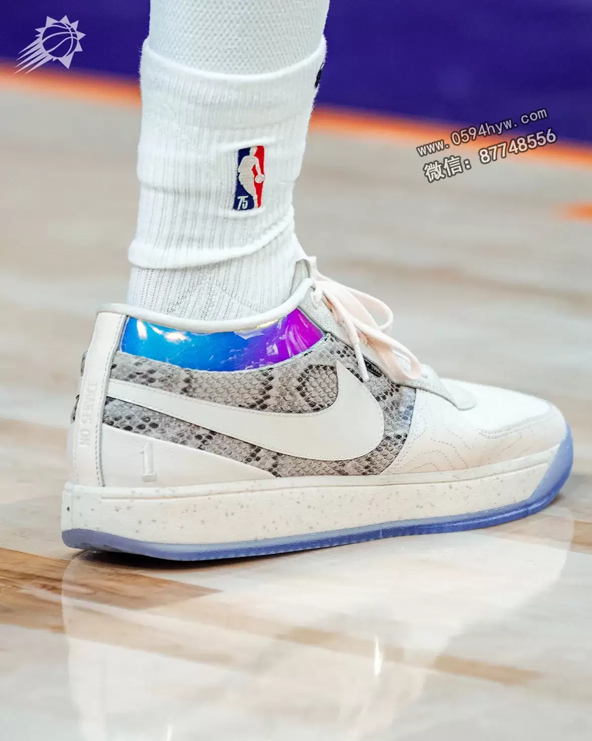 在德文-布克对阵亚特兰大老鹰队的热身赛中,耐克 Book 1 “What The” PE以全白的简洁外观亮相。这双球鞋并没有发布,但却立即引发了人们的关注,因为布克将他球鞋系列中的每一个标志性细节都融入了个人 PE 中。