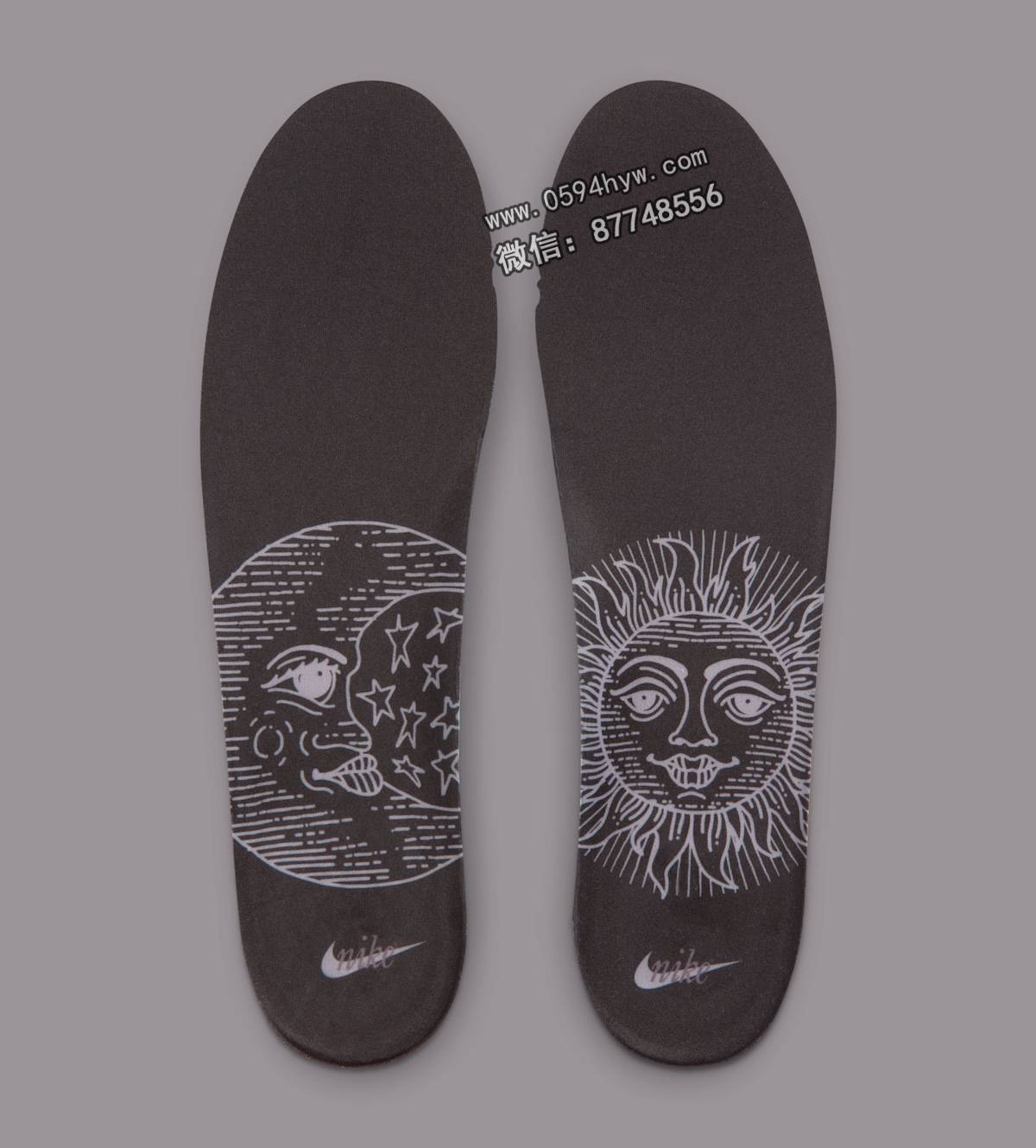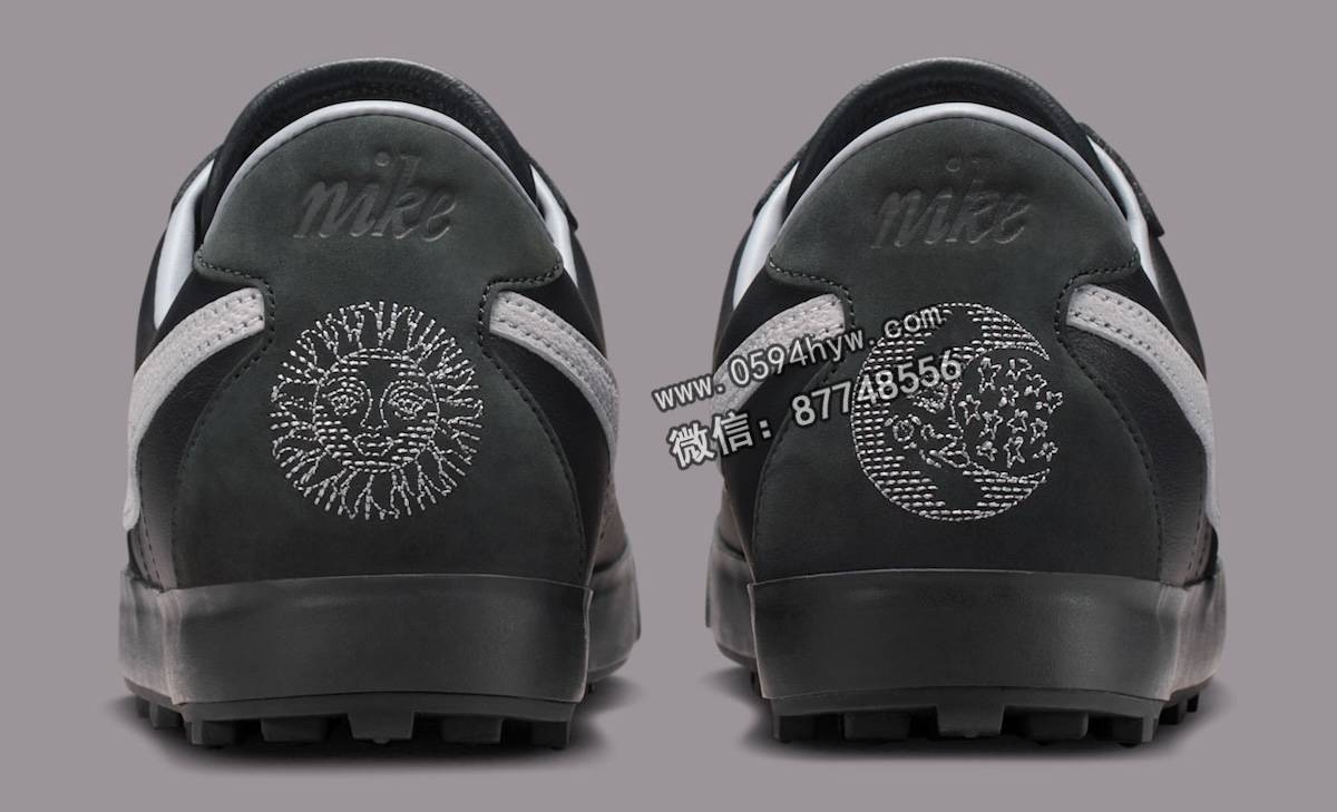 黑色光滑皮革为鞋款奠定了基础,灰色麂皮平底 Swoosh 则为鞋款提供了非黑色的点缀。鞋跟处绣有太阳和月亮图案,为鞋款带来个性的同时又不失内敛的品味。鞋垫上也绣有同样的图案,延续了日夜交替的主题,令人惊喜的是,这种感觉是有机的。